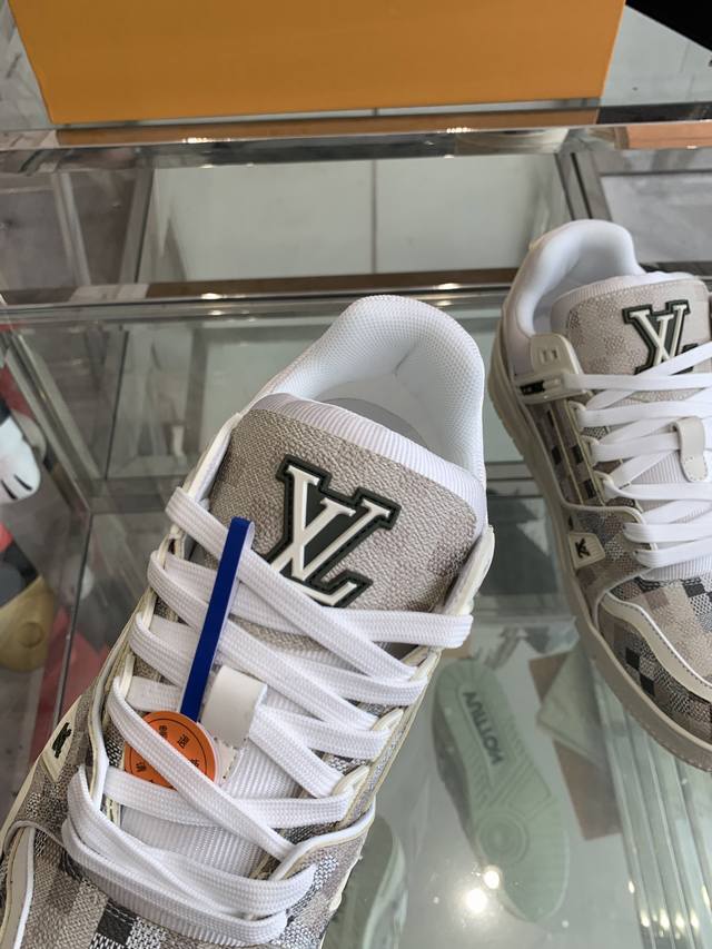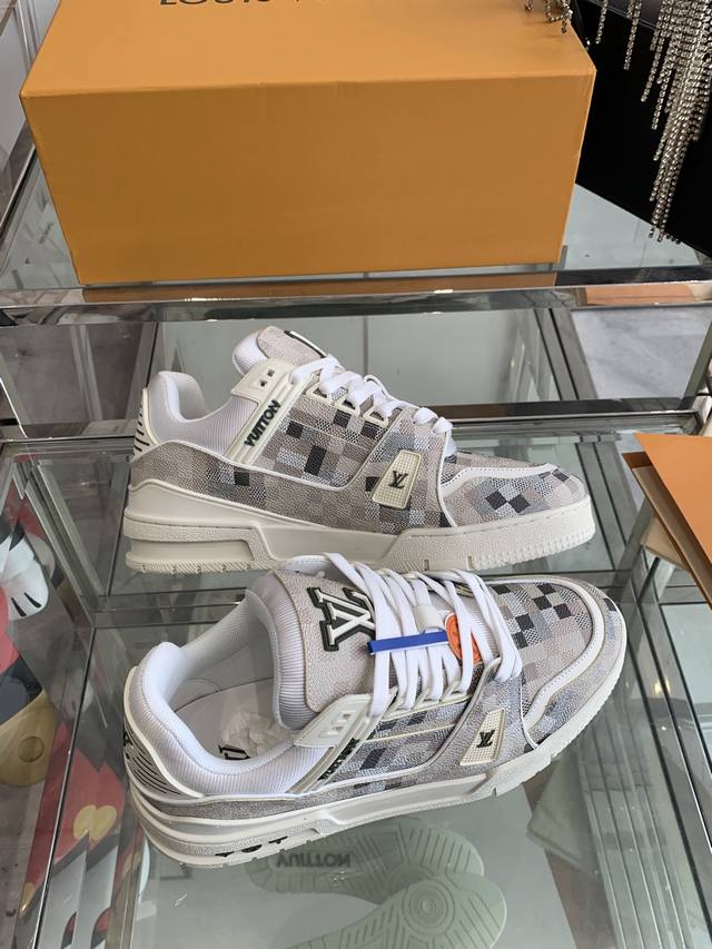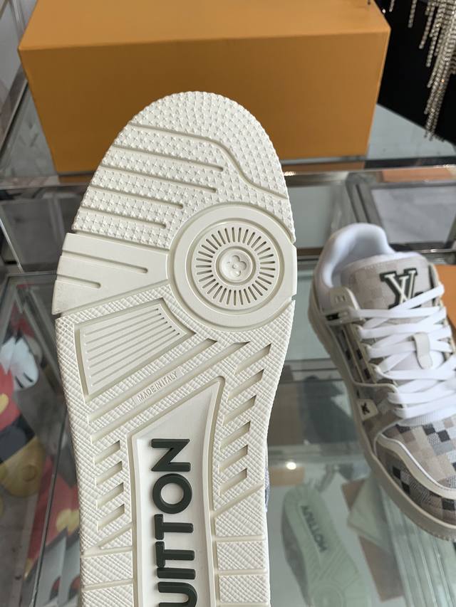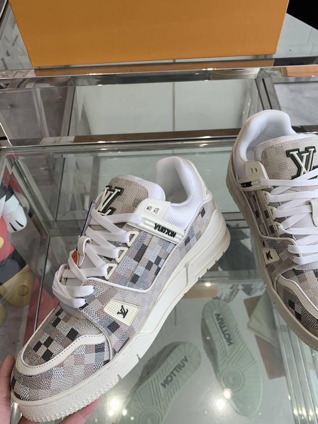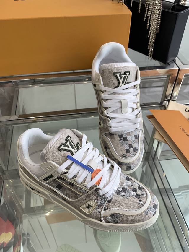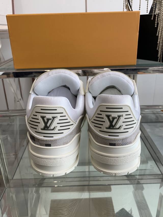 原版购入开发 做货 本款LV Trainer 运动鞋选用牛皮革塑造繁复鞋面,需要数小时的匠心缝制方可完成。经典构型出自 Virgil Abloh 之手,展现复古篮球鞋的灵感启发