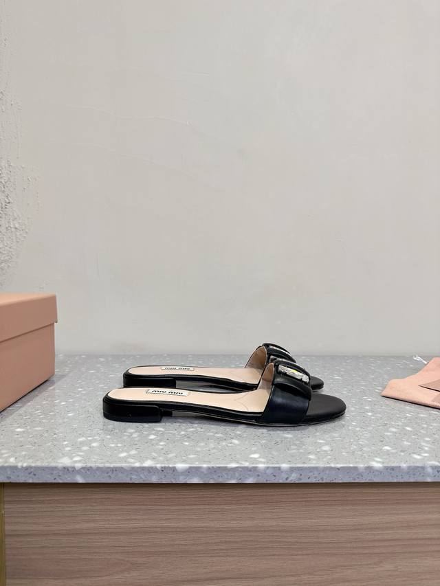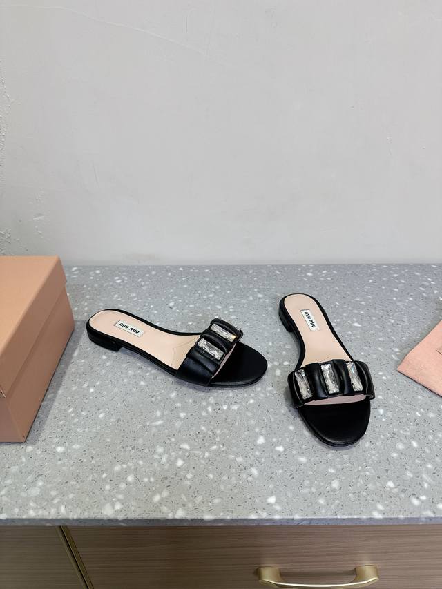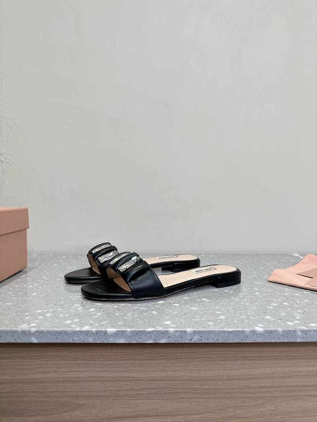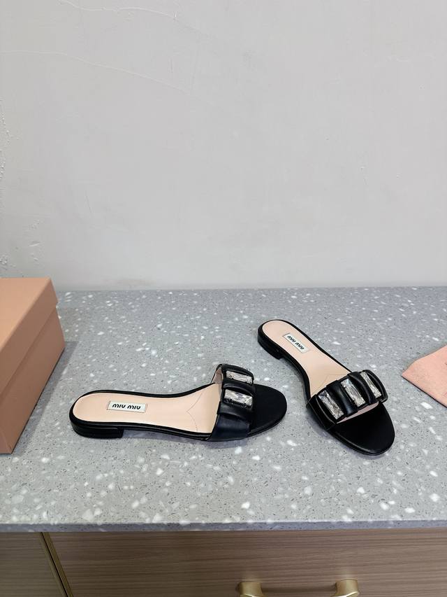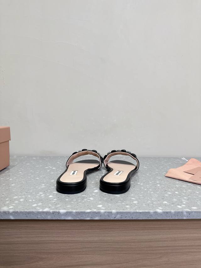 Miu Miu 缪缪 25ss早春新款 平底 水钻拖鞋乖巧减龄 上脚显腿长又高级 舒适度也做到完美 日常穿着超级合适 穿脱方便 超级哇塞鞋面:原版进口牛漆皮 哑