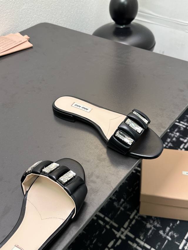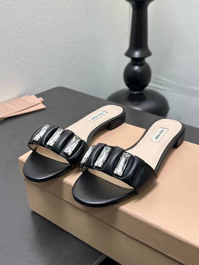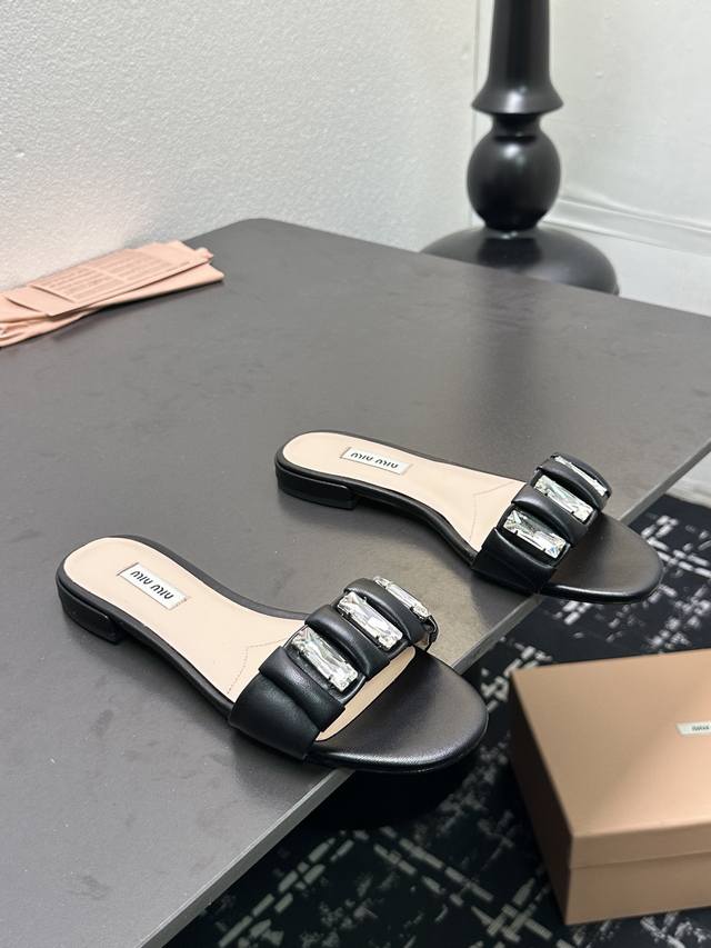 / Miu Miu2025*新款平底凉拖乖巧减龄 上脚显腿长又高级 舒适度也做到完美 日常穿着超级合适 穿脱方便 超级哇塞鞋面:牛漆皮内里垫脚羊皮真皮大底码数:35