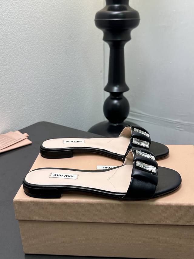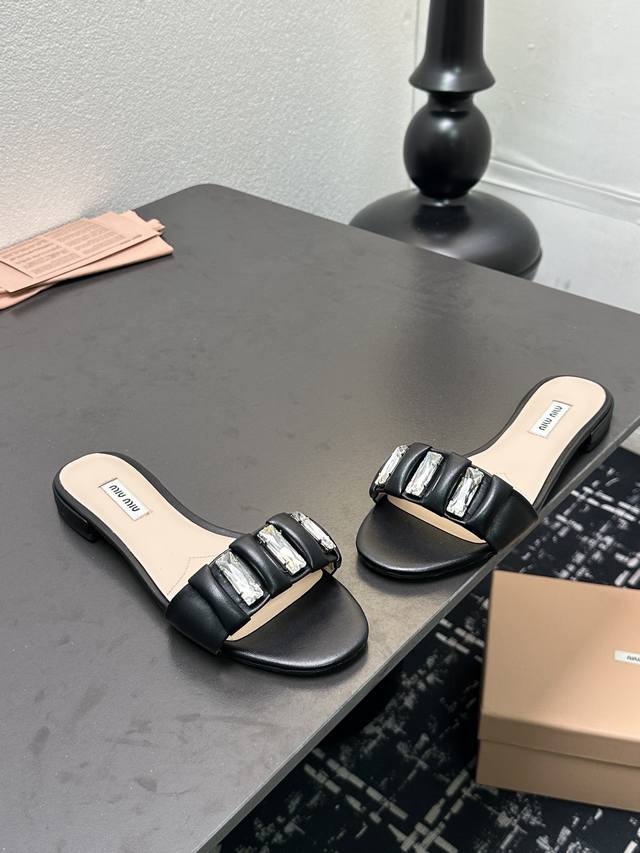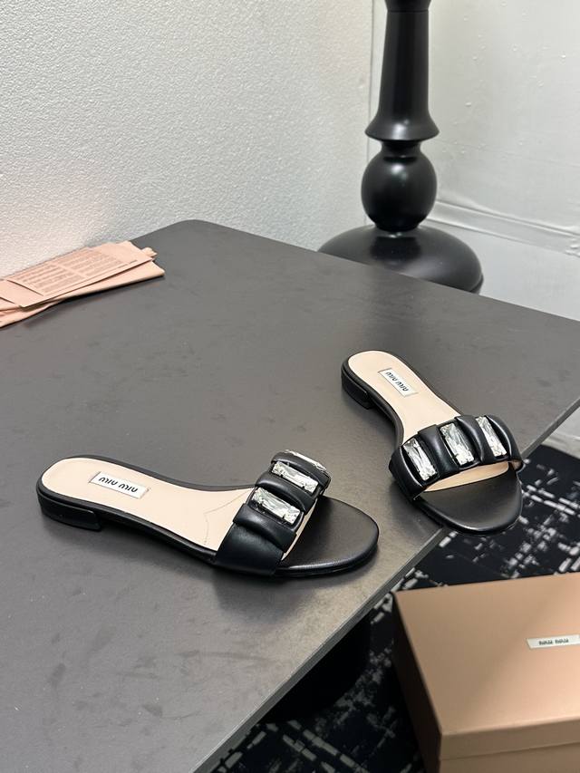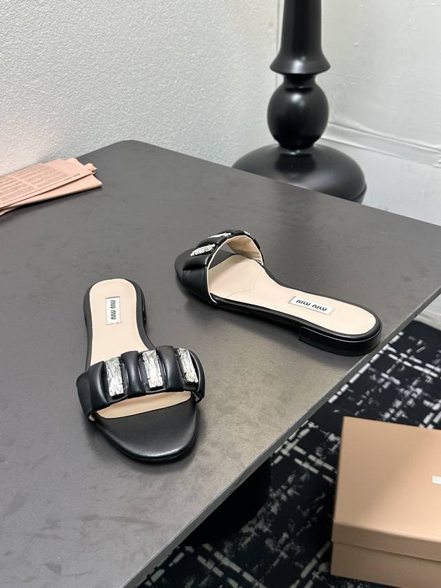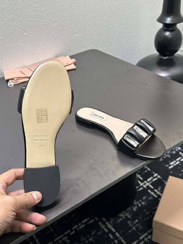 Miu Miu2025*新款平底凉拖乖巧减龄 上脚显腿长又高级 舒适度也做到完美 日常穿着超级合适 穿脱方便 超级哇塞鞋面:牛漆皮内里垫脚羊皮真皮大底码数:35