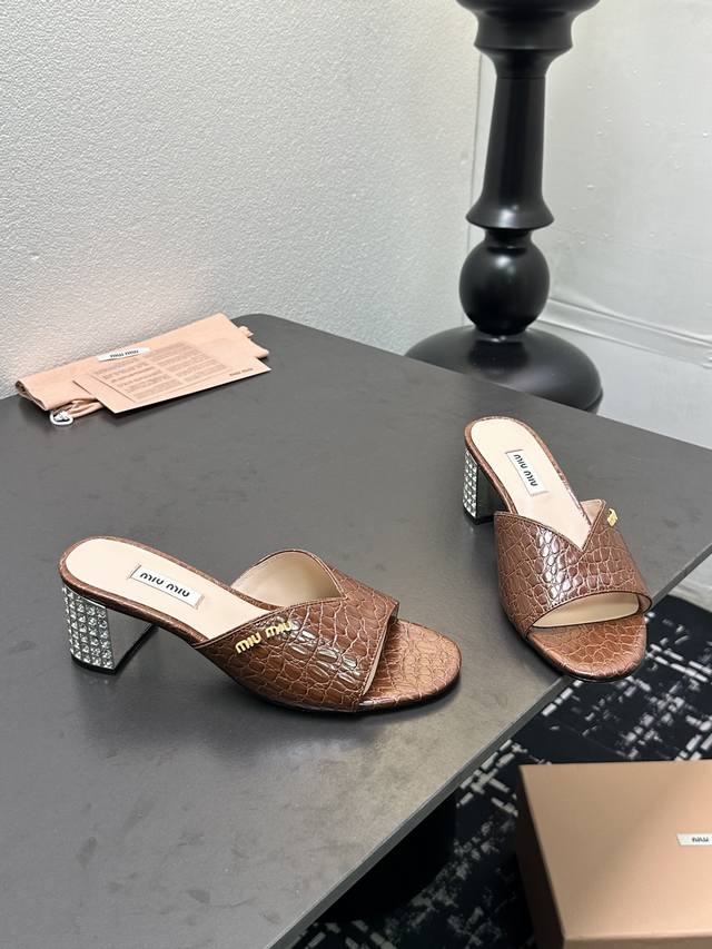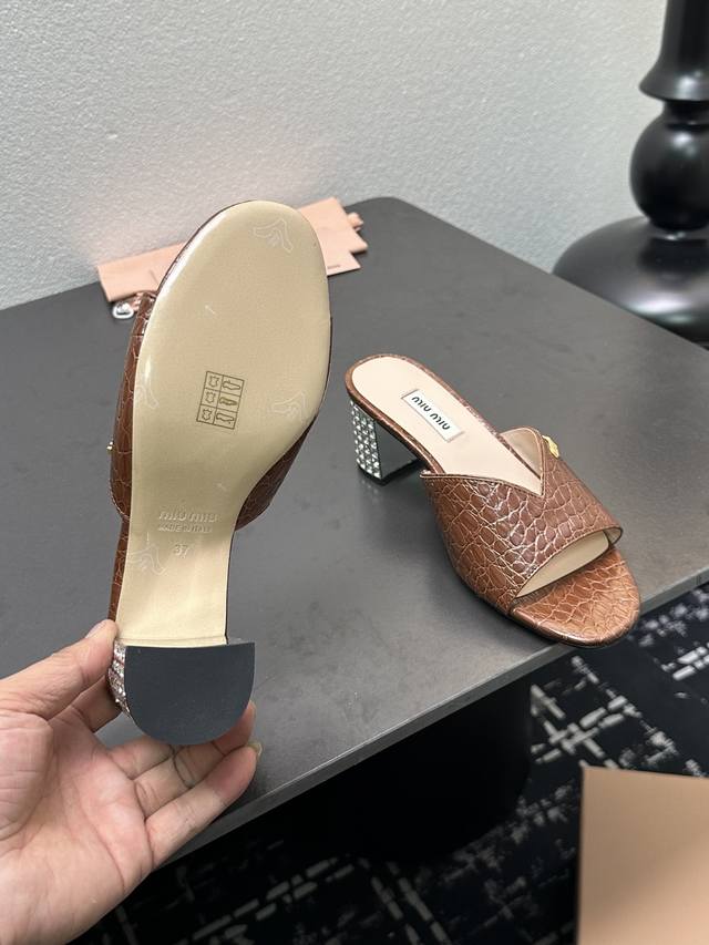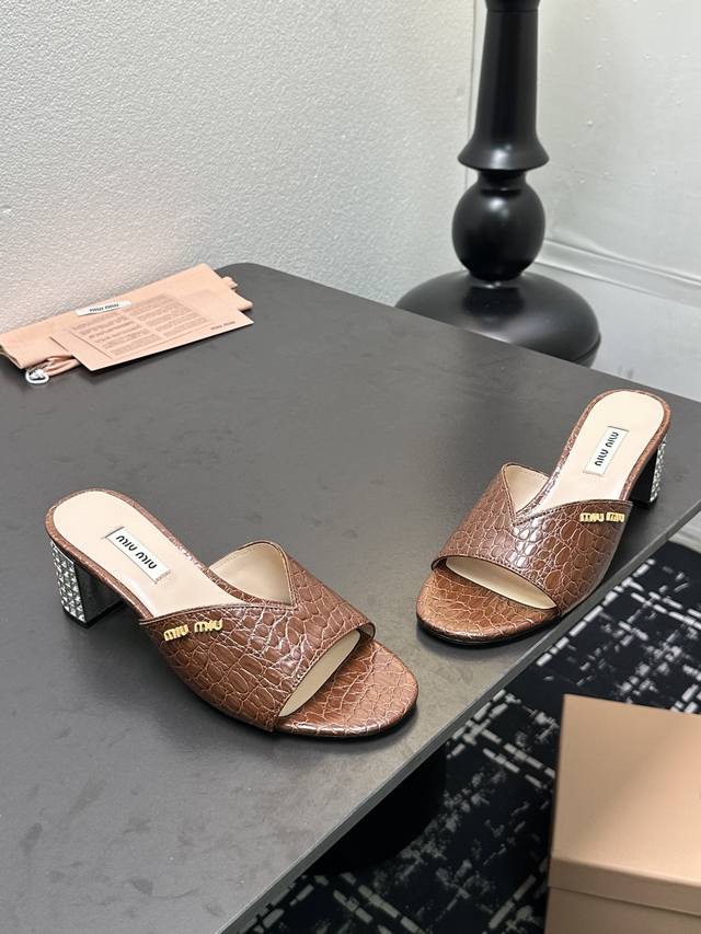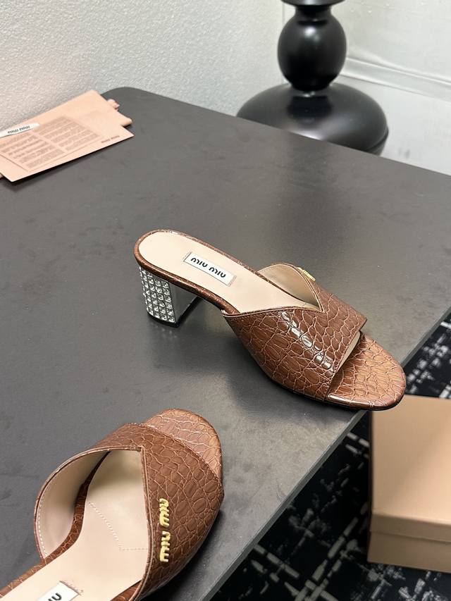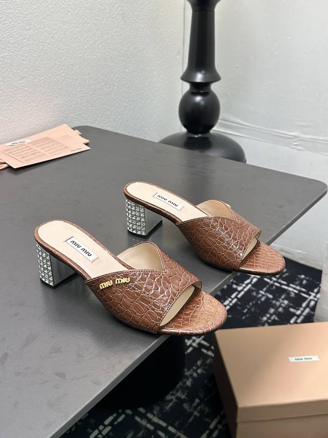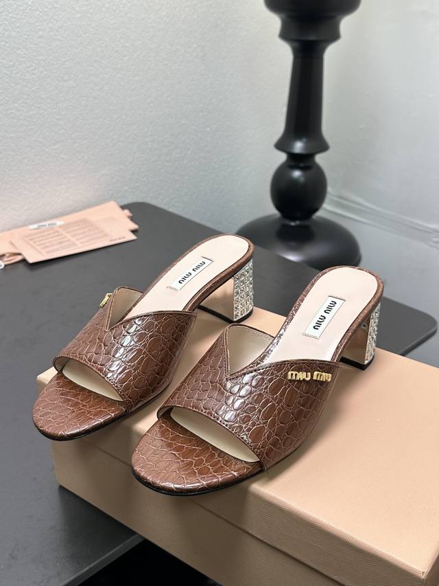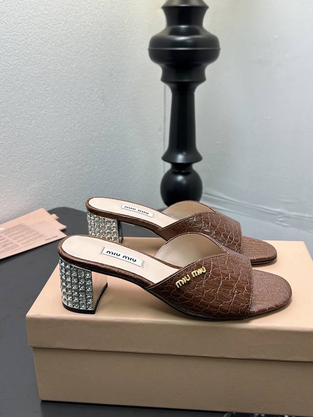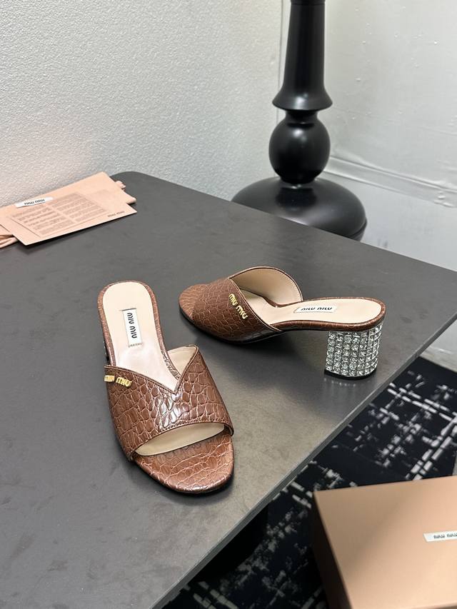 MiuMiu*2025ss缪缪春夏新款高跟镶钻小牛皮凉鞋拖鞋
