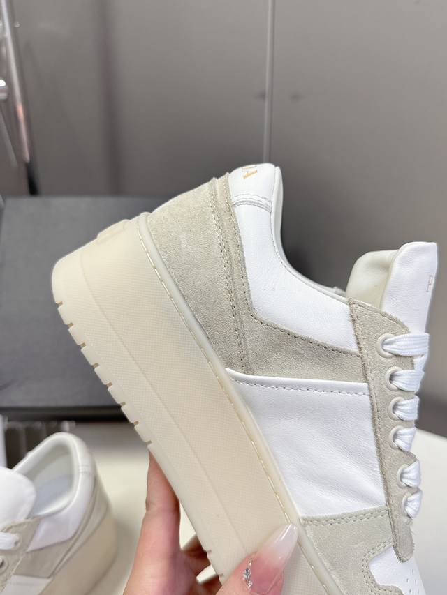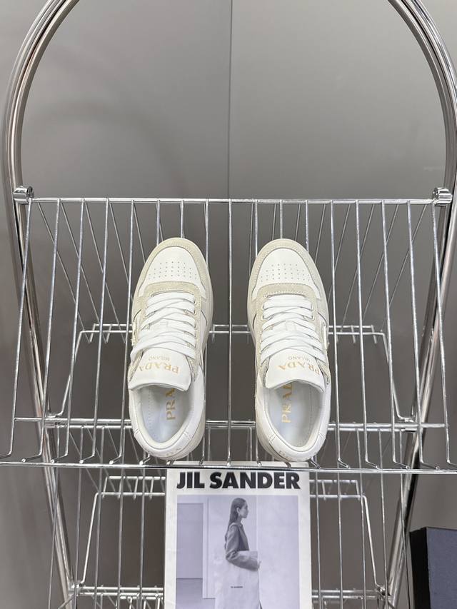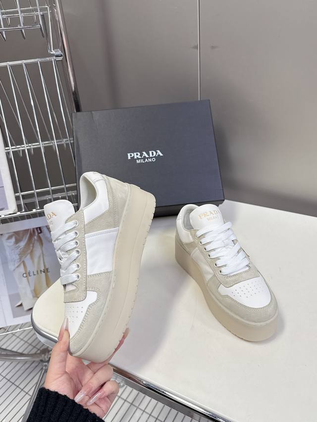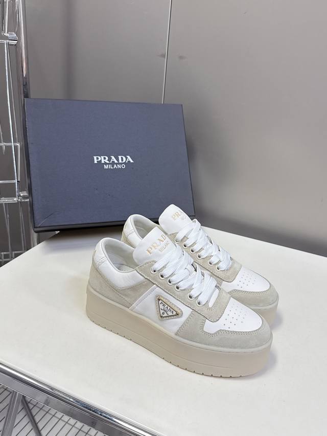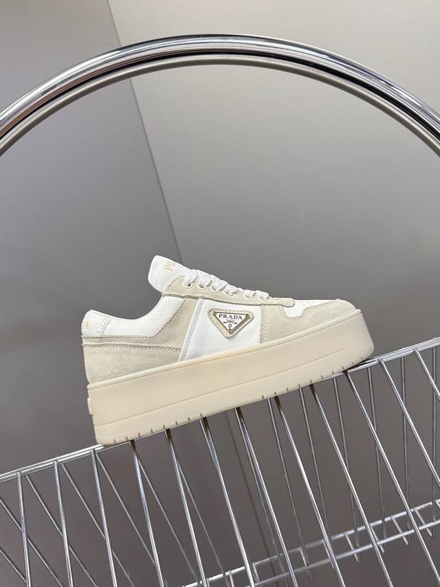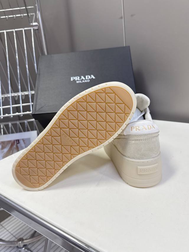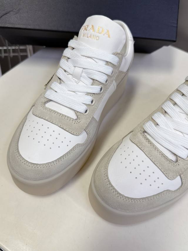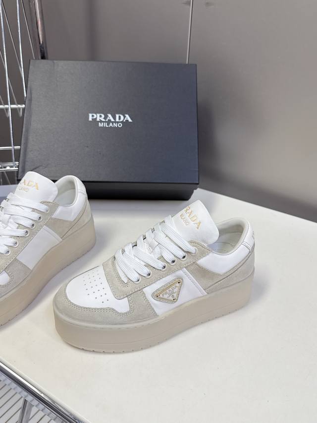 Prada普拉达春夏新款厚底德训鞋小白鞋麂皮和光面皮拼接撞色,细节感跟好 三角标点缀,简单高级!关键上脚超显腿长,轻松拉长腿部显腿!妥妥的增高神器 原版开模大底