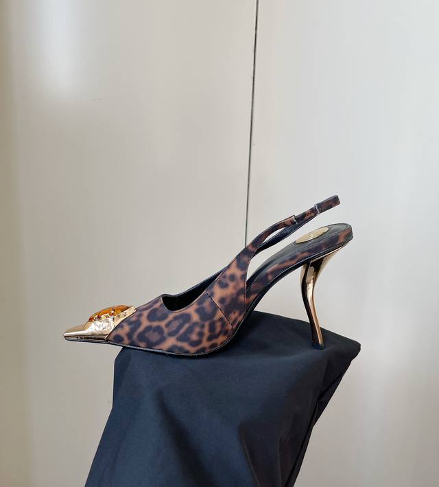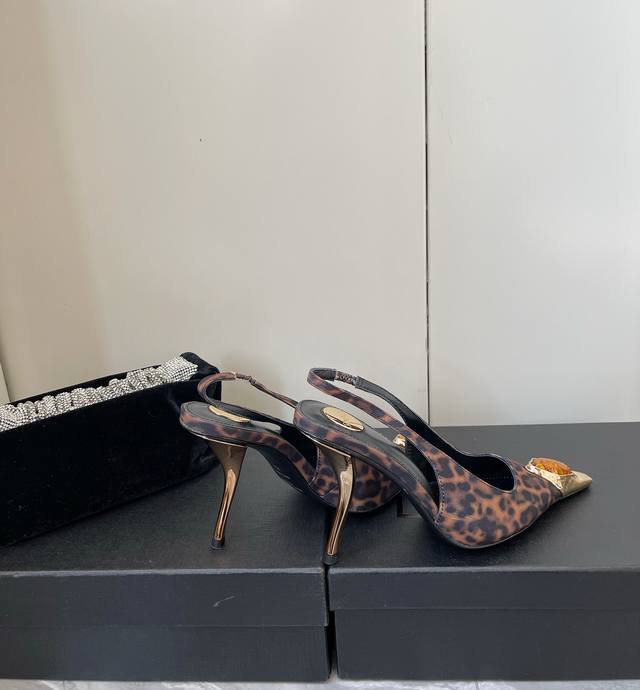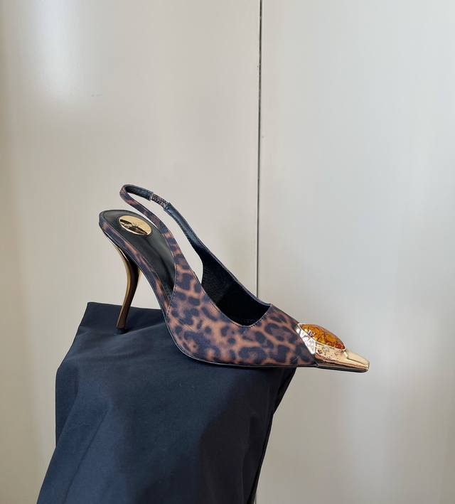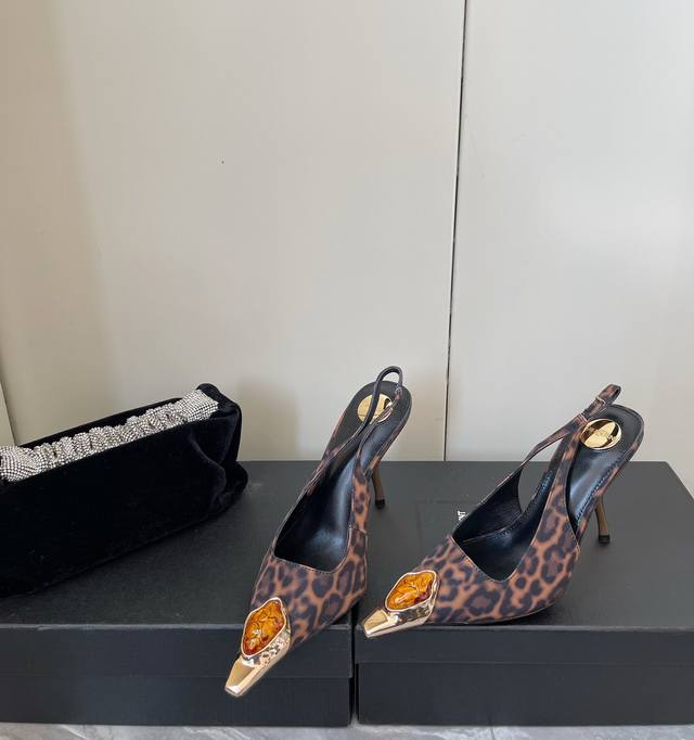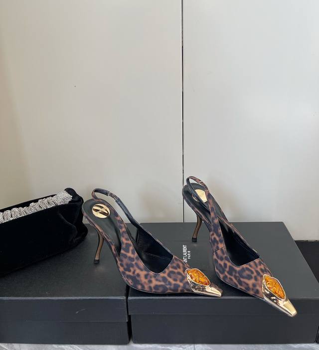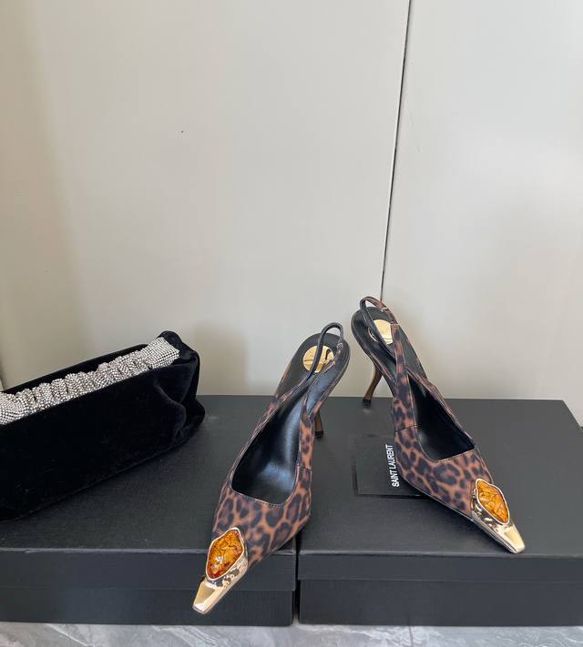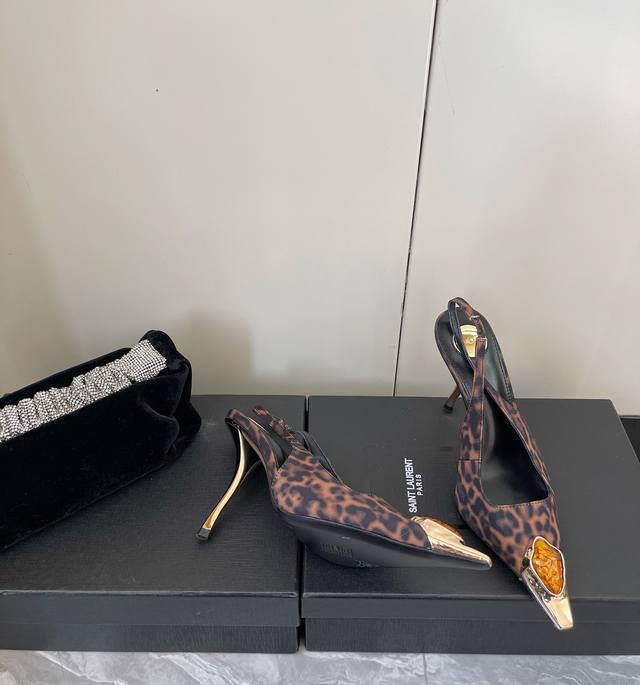 YSL 圣罗兰最新黄金铁头宝石logo小方头后空高跟单鞋