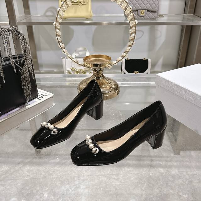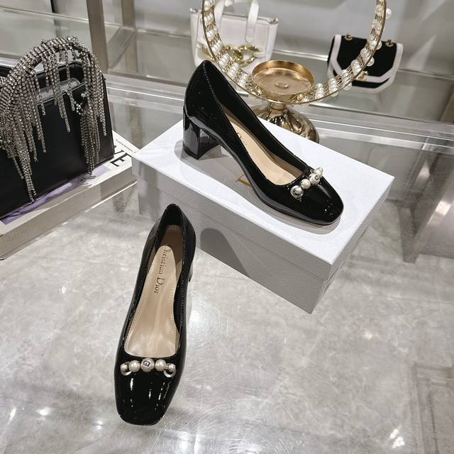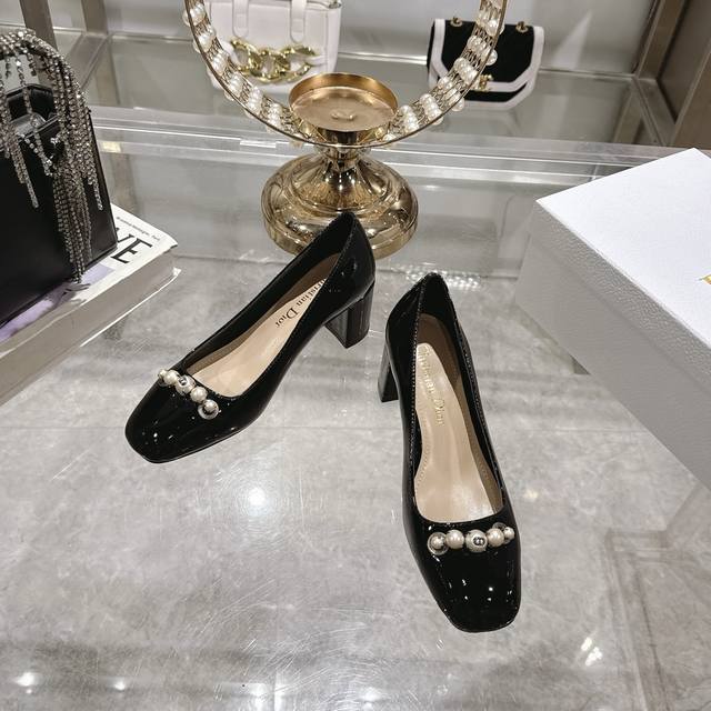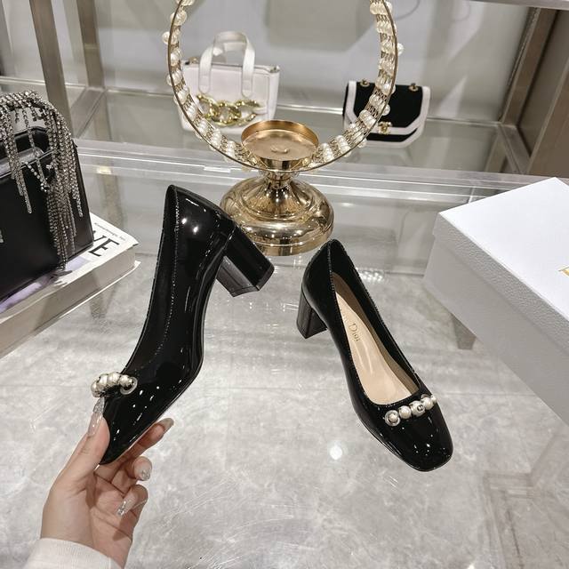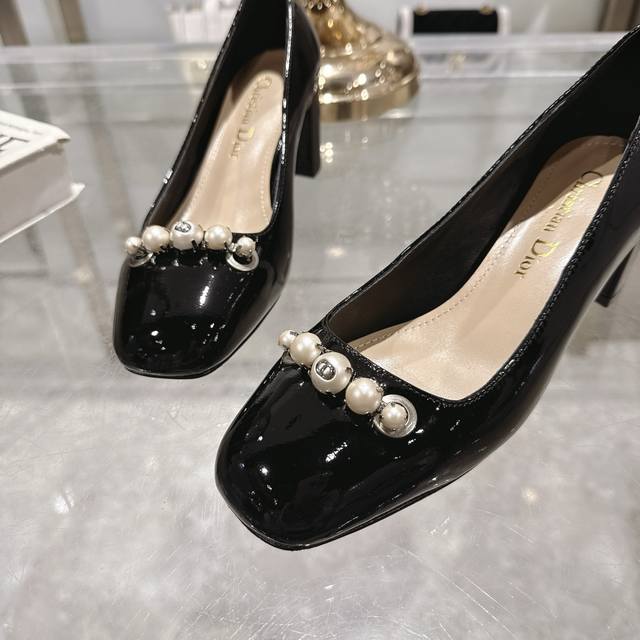 25Ss早春新款迪奥Dior Paris 露跟高跟鞋Cd珍珠扣粗跟后空凉鞋