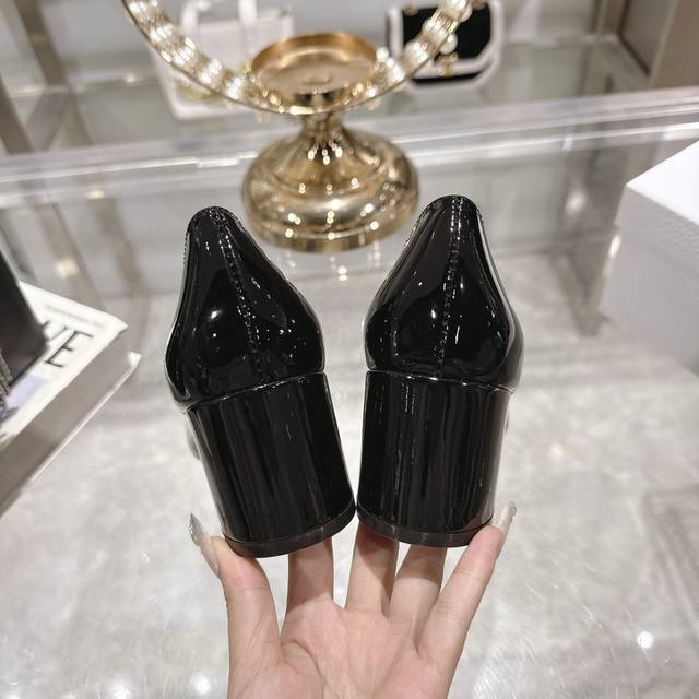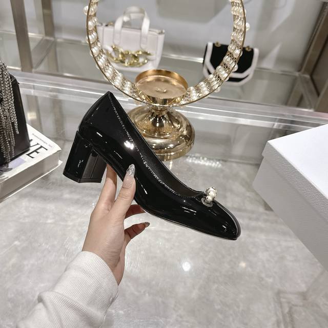 这款 Dior Paris 露跟高跟鞋是二零二五春夏成衣系列新品,重新演绎罗杰·维威耶(Roger Vivier)的档案设计。漆皮牛皮革鞋面,正面饰以白色树脂珠饰,其中一颗点缀以Cd标志。可调节系带搭配搭扣,与5.5厘米粗跟和方形鞋头设计相得益彰,可为本季的各式造型增添高雅气质。