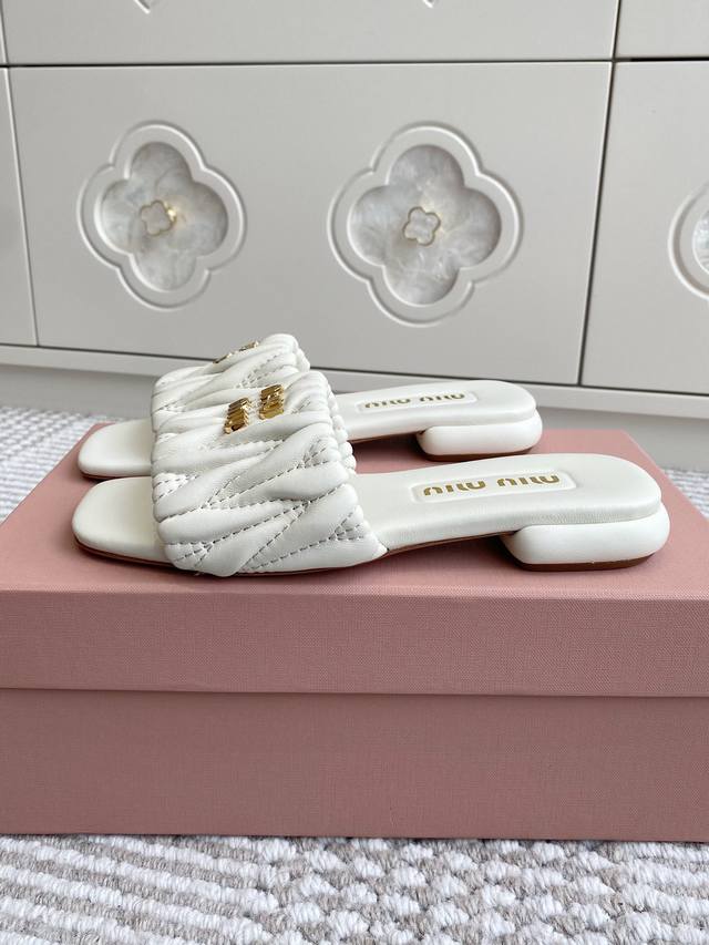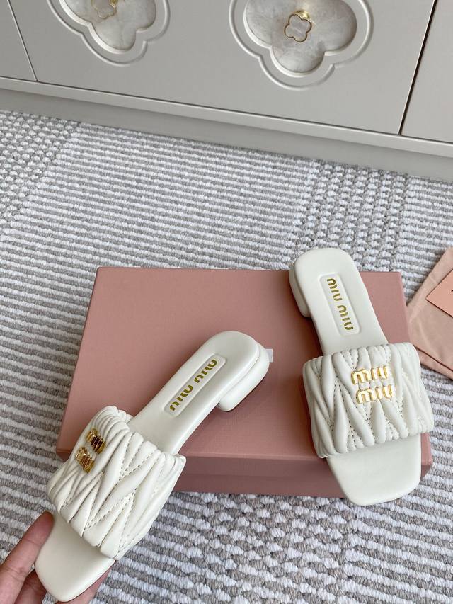 / 代购级Miumiu缪缪新品 Matelasse褶皱羊皮平底拖鞋 材质与工艺: 原版定制羊皮 定制羊皮内里 原版定制开模Logo 进口真皮大底 Size:35-3