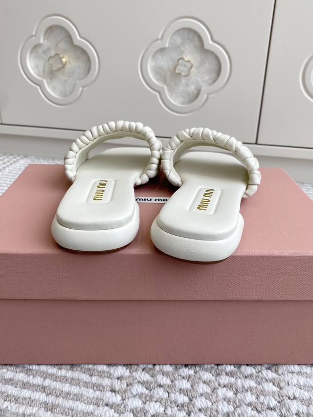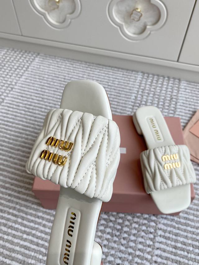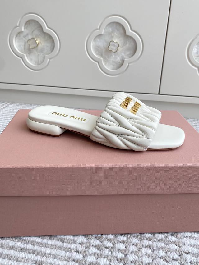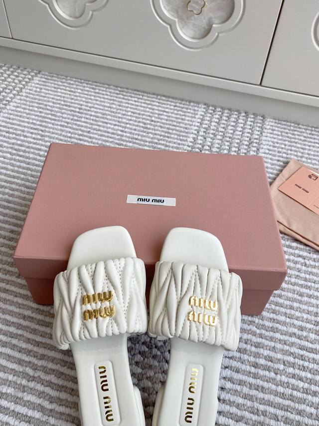 代购级Miumiu缪缪新品 Matelasse褶皱羊皮平底拖鞋 材质与工艺: 原版定制羊皮 定制羊皮内里 原版定制开模Logo 进口真皮大底 Size:35-3