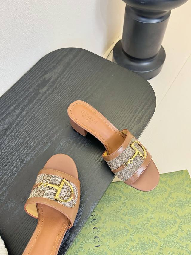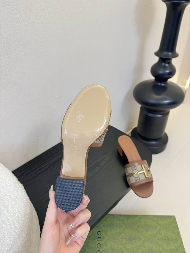 / Gucci最新D字马衔扣拖凉鞋 专柜同步 顶级版本、原版1:1复制 鞋面:羊皮 老花G帆布 内里 垫脚:全粒小羊皮 鞋底:真皮大底 跟高:5.5Cm 配码:35