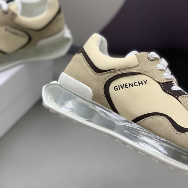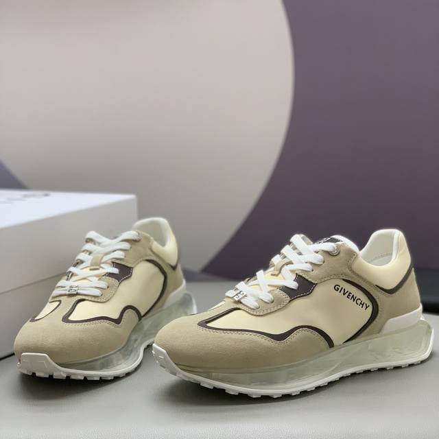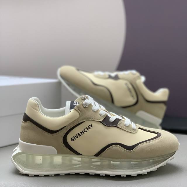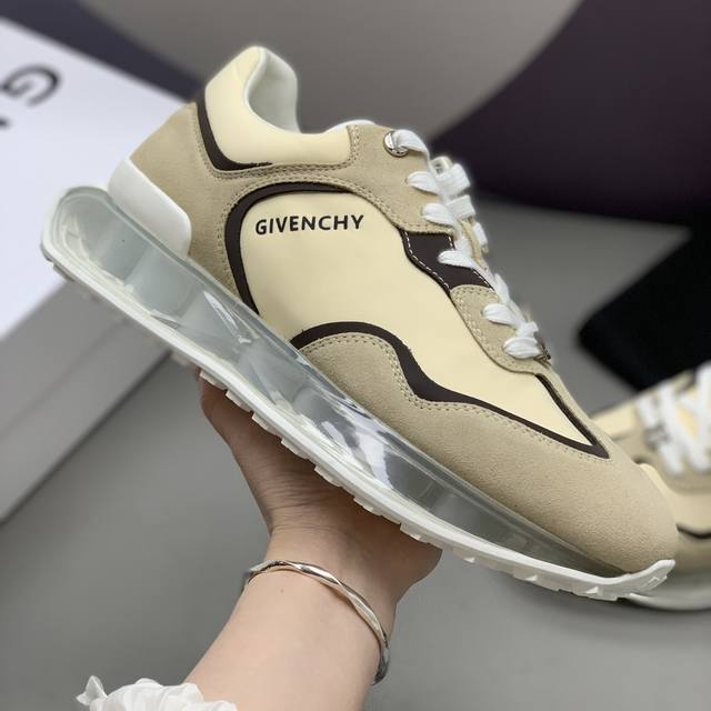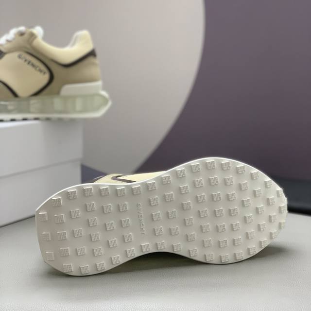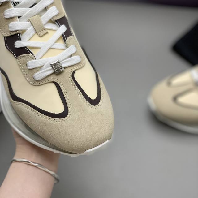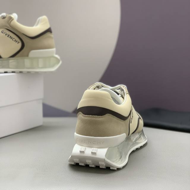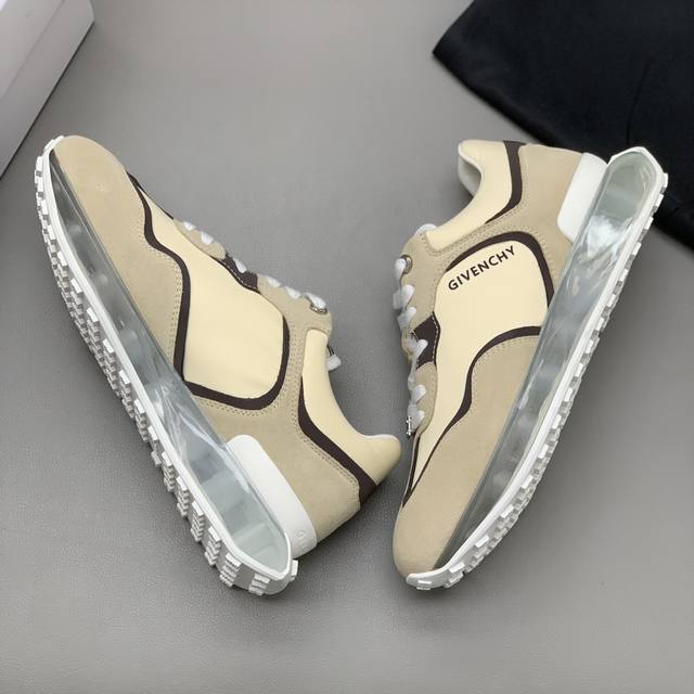 男士低帮休闲鞋 -采用拼色镂空皮革材质,鞋舌点缀4G Logo,侧面饰以Logo字母印花 -复古设计,轻盈透明和白色科技鞋底。 码数:39-45