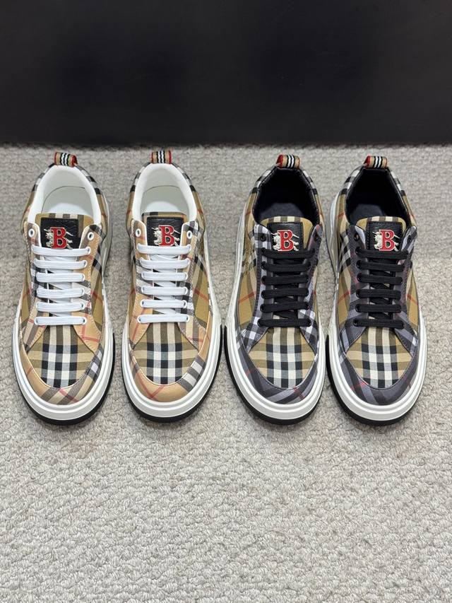 2025新款巴宝莉家男士经典低帮运动鞋,以 Vintage 复古格纹棉搭配牛皮材质焕新演绎,装饰焕新的品牌徽标。羊皮内里,耐磨防滑橡胶大底!