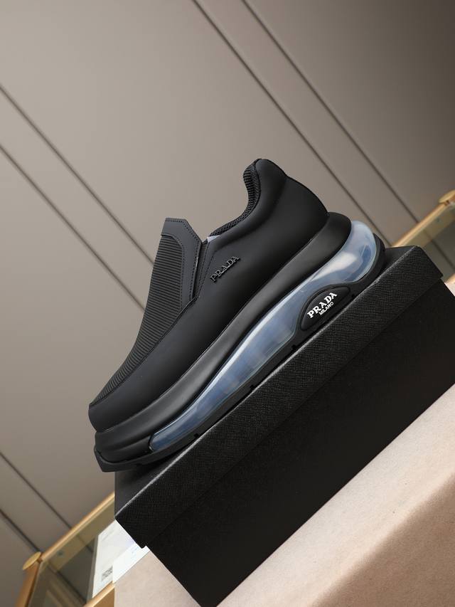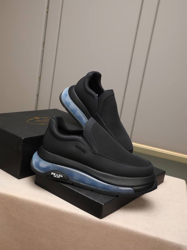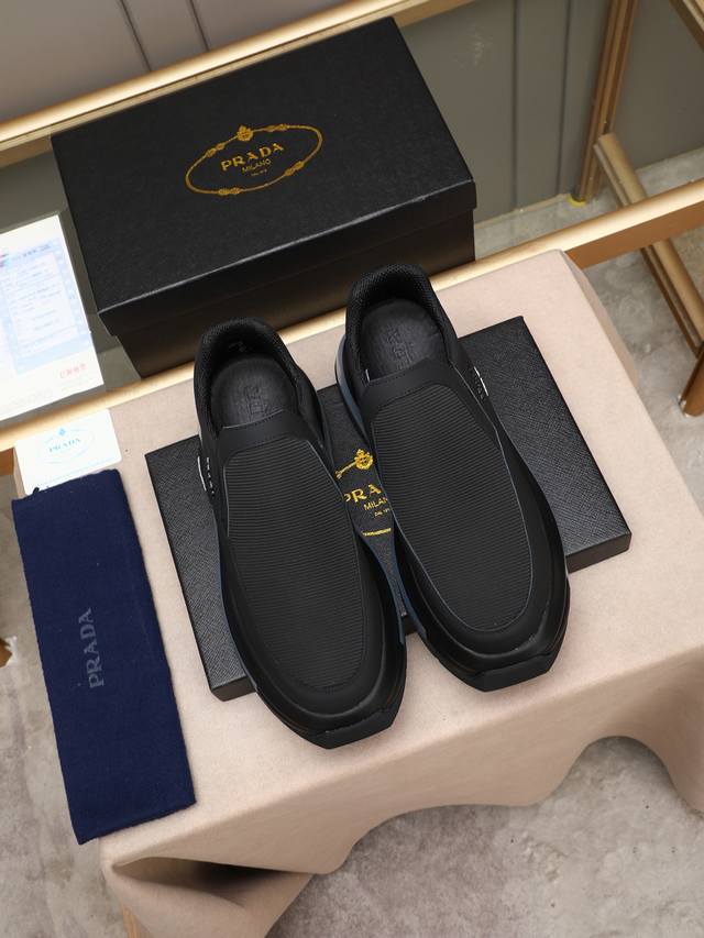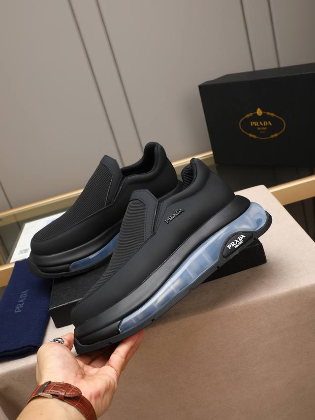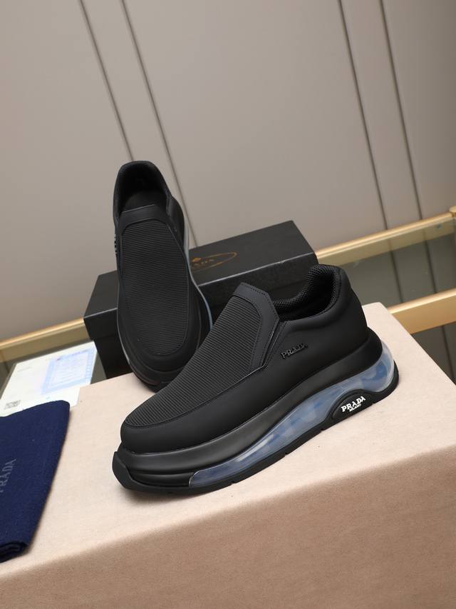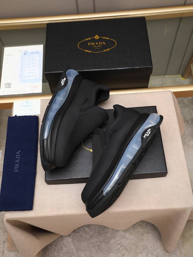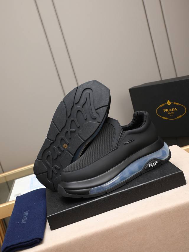 p 普拉达男士休闲出货,采用进口牛皮鞋面内里小羊皮,原厂气垫底,橡胶缝制工艺,橡胶底层铺垫,减震效果极好,上脚舒适! Size:39-44 38 45定做