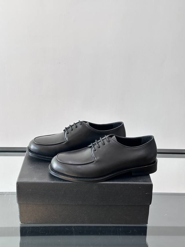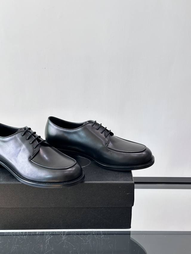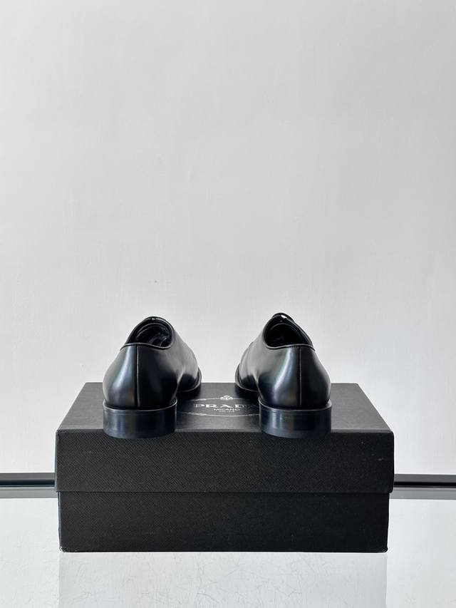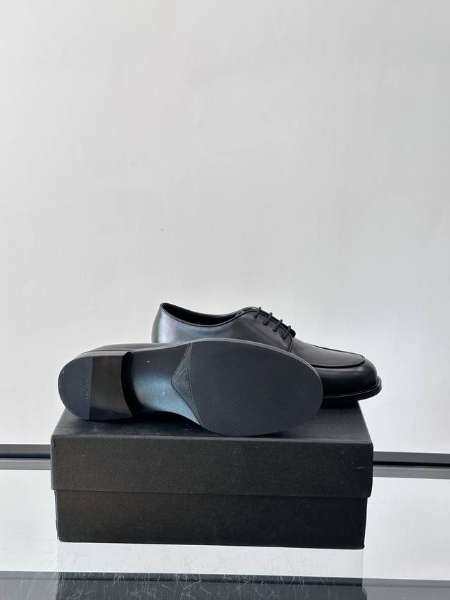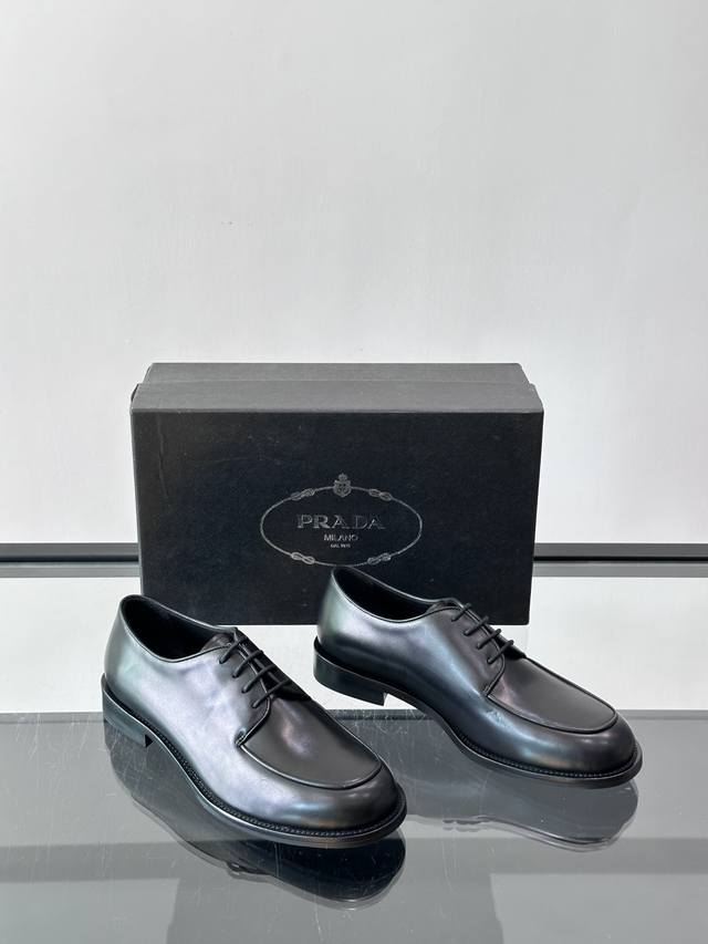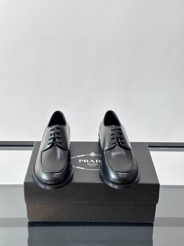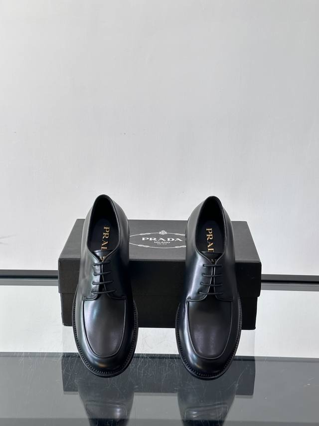 prad*家新款 男士系带休闲皮鞋选用进口头层黑色小牛皮材质,质感满满,挺括和圆形鞋头设计, 原版开模真皮大底,天然牛皮内里,提升气场必备单品!