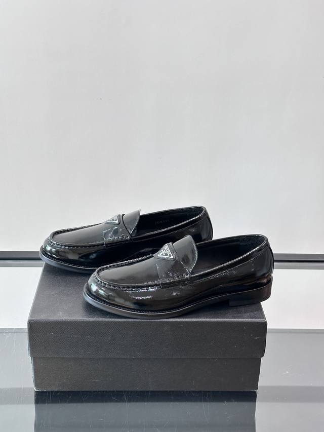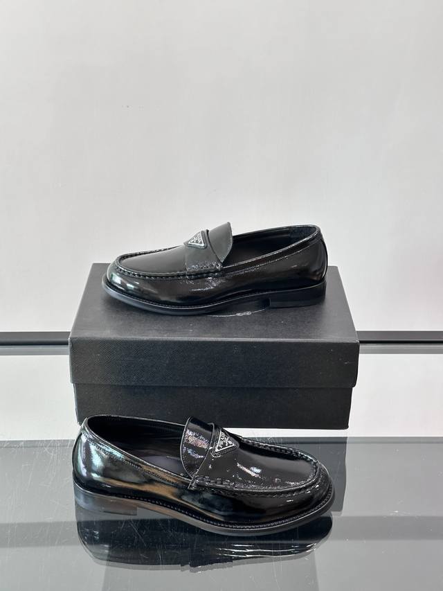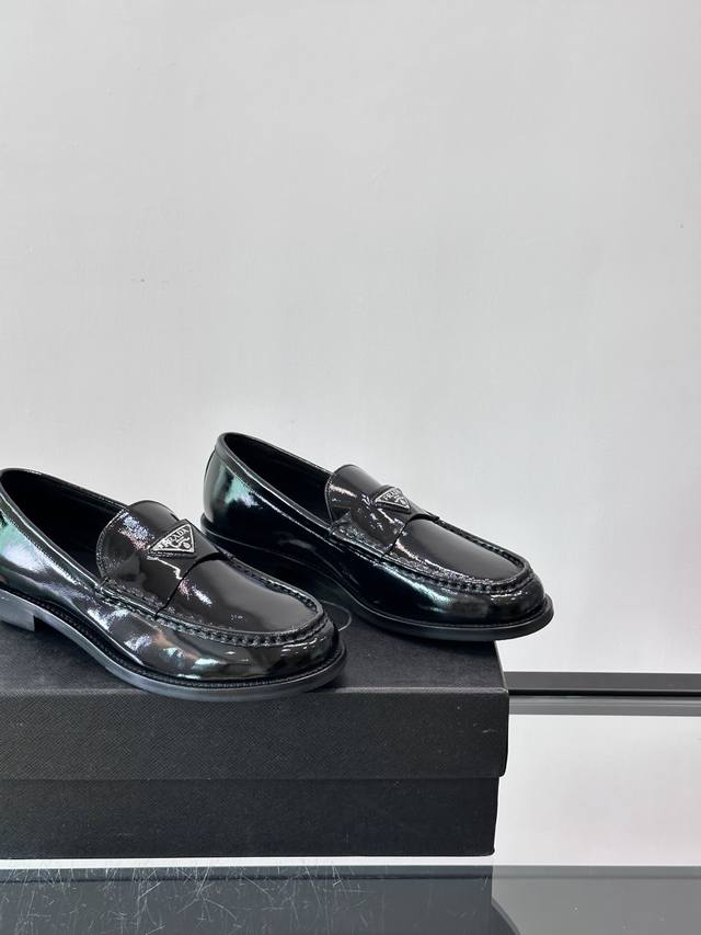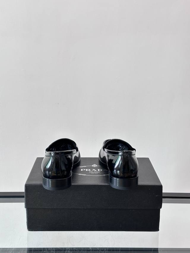 / prada 普拉达新款亮面皮革皮鞋采用意大利进口开边珠鞋面,大块拼接设计,耐穿不变形,重工打造,精致马克缝线,同材质饰带装饰,融合经典和现代风格,内里本染小牛皮
