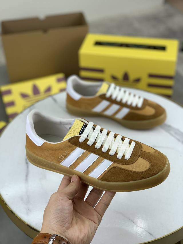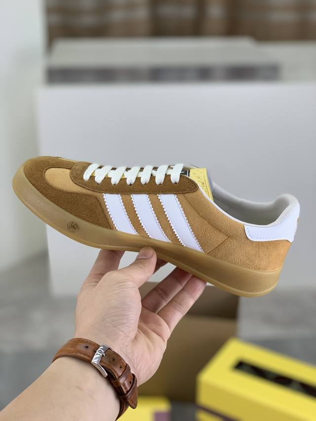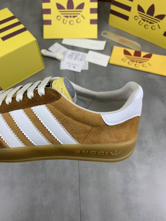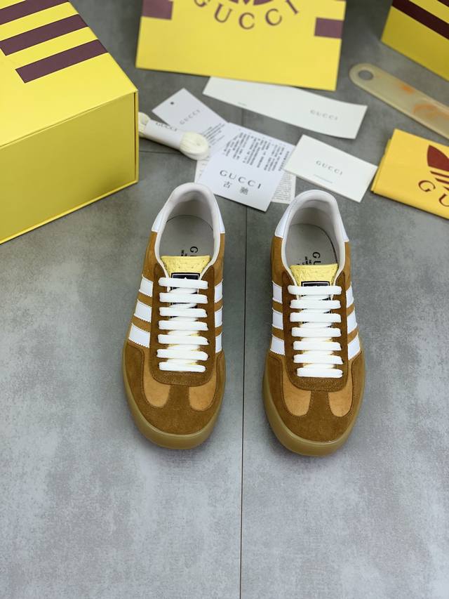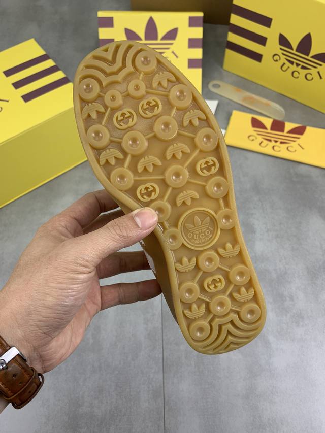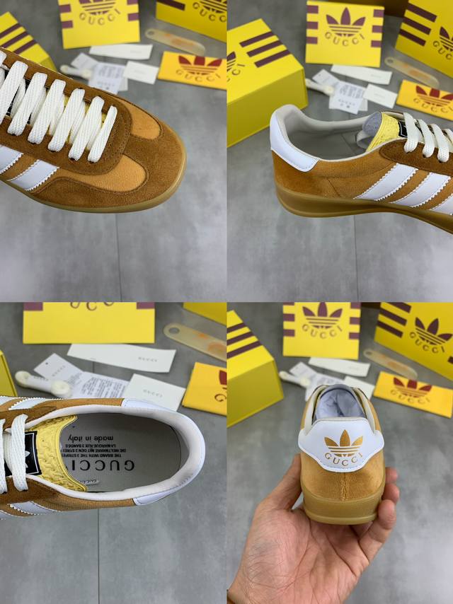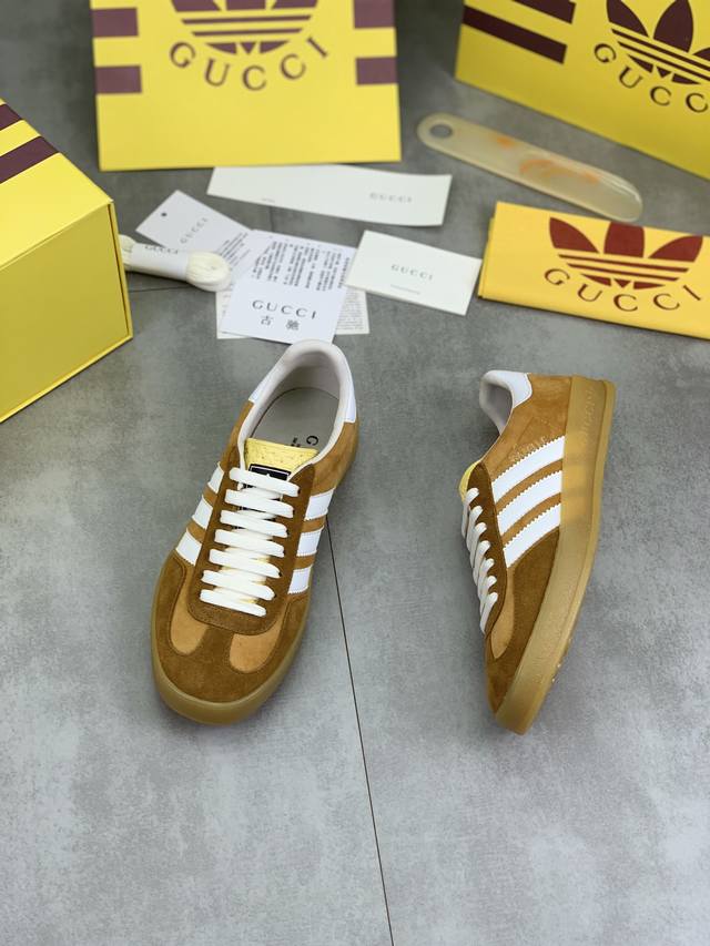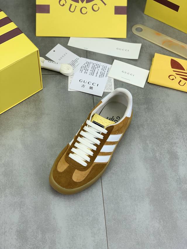 原版购入开发 做货 阿迪达斯x古驰世纪联名爆款 融汇两个品牌丰富且历史悠久的典藏元素,Adidas X Gucci联名系列在三根线条的组合中承袭品牌历史及标志性设计语言 创作总监亚力山卓 米开理从80年代和90年代的美好回忆中汲取灵感,缔造兼具怀旧风格和现代气质的出众系列 这款gazelle运动鞋饰有trefoil印花和三叶草 条纹