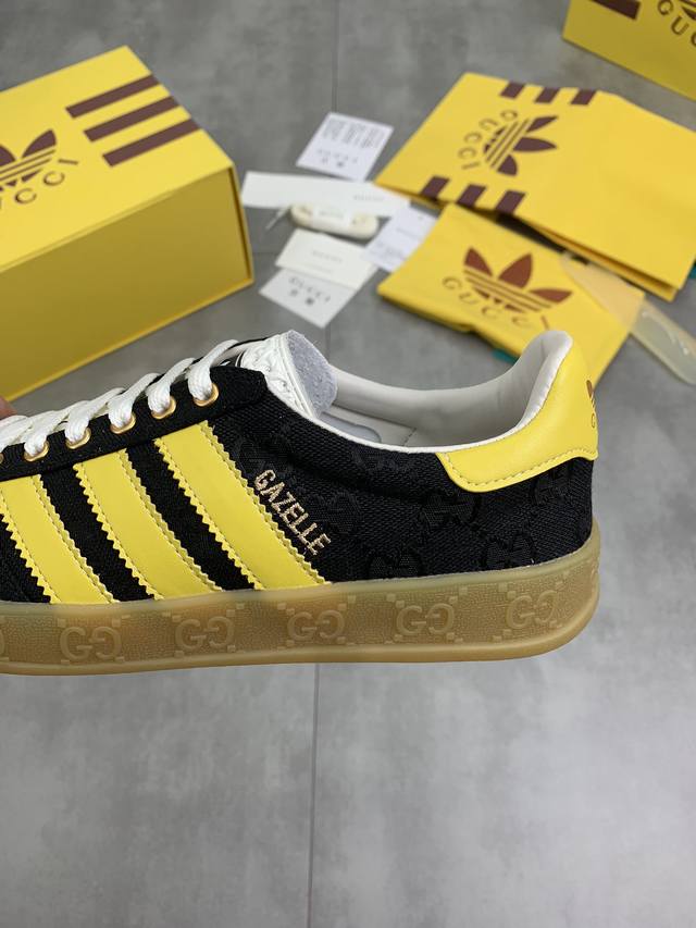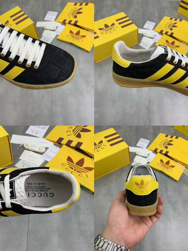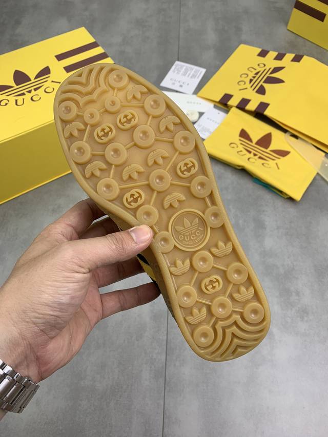 原版购入开发 做货 阿迪达斯x古驰世纪联名爆款 融汇两个品牌丰富且历史悠久的典藏元素,Adidas X Gucci联名系列在三根线条的组合中承袭品牌历史及标志性设计语言 创作总监亚力山卓 米开理从80年代和90年代的美好回忆中汲取灵感,缔造兼具怀旧风格和现代气质的出众系列 这款gazelle运动鞋饰有trefoil印花和三叶草 条纹