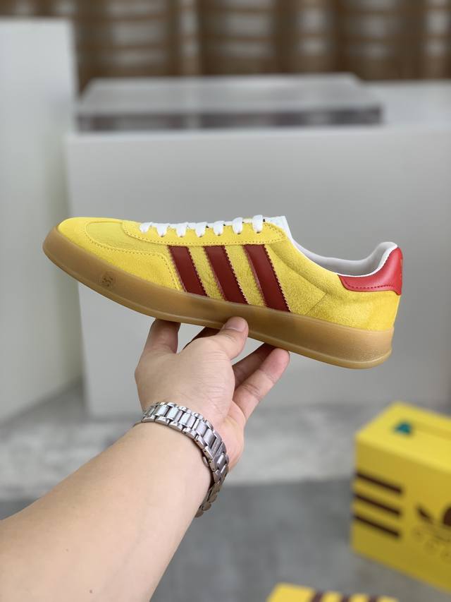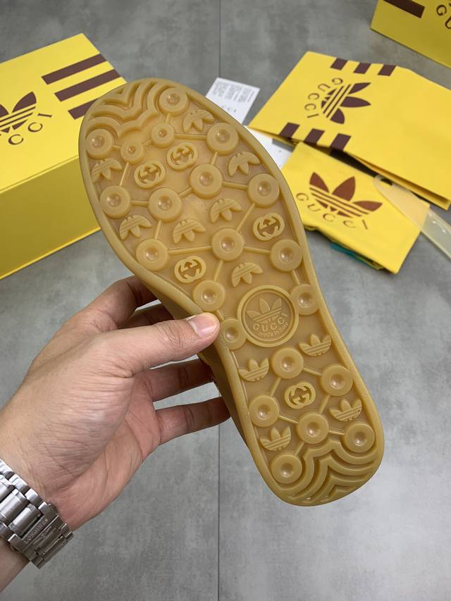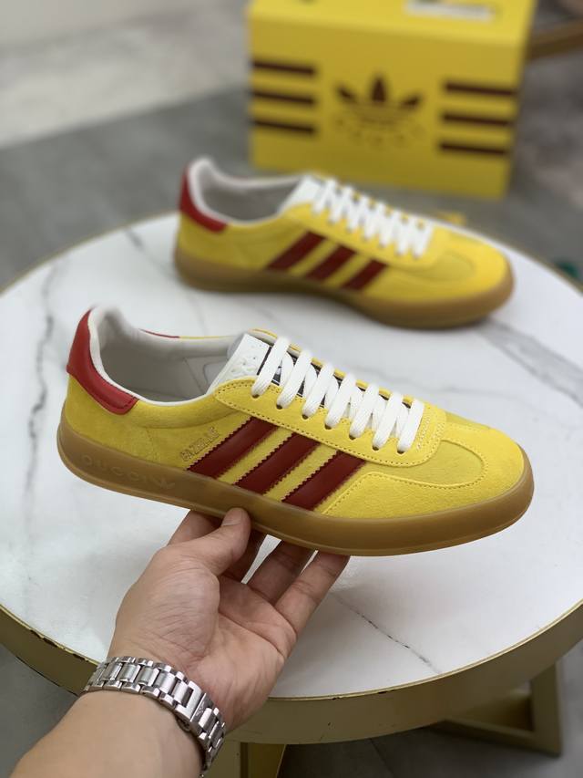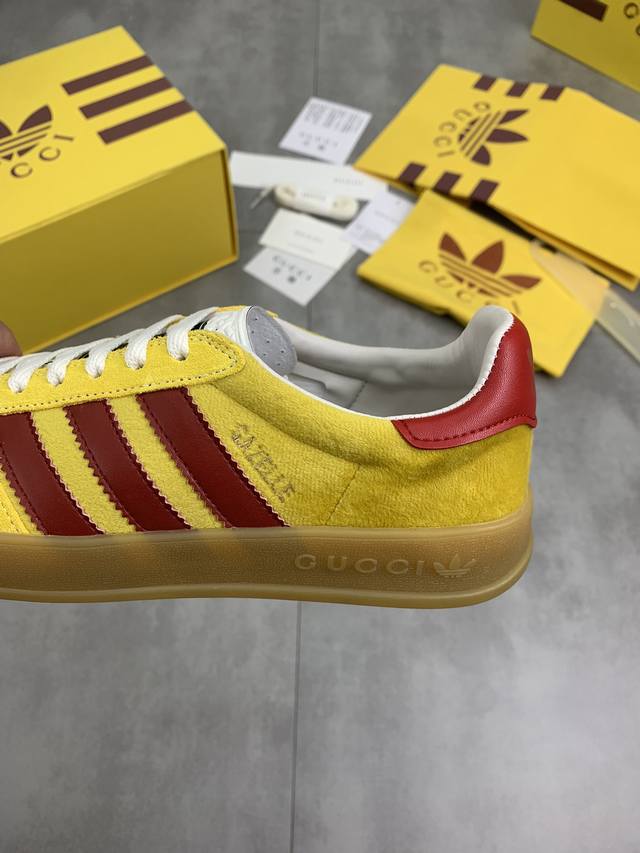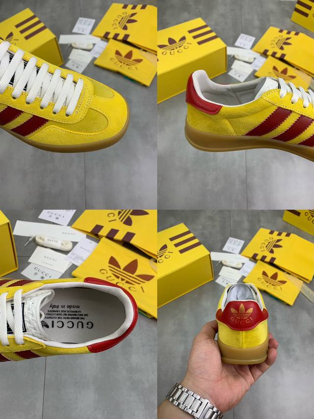 原版购入开发 做货 阿迪达斯x古驰世纪联名爆款 融汇两个品牌丰富且历史悠久的典藏元素,Adidas X Gucci联名系列在三根线条的组合中承袭品牌历史及标志性设计语言 创作总监亚力山卓 米开理从80年代和90年代的美好回忆中汲取灵感,缔造兼具怀旧风格和现代气质的出众系列 这款gazelle运动鞋饰有trefoil印花和三叶草 条纹