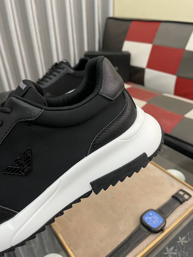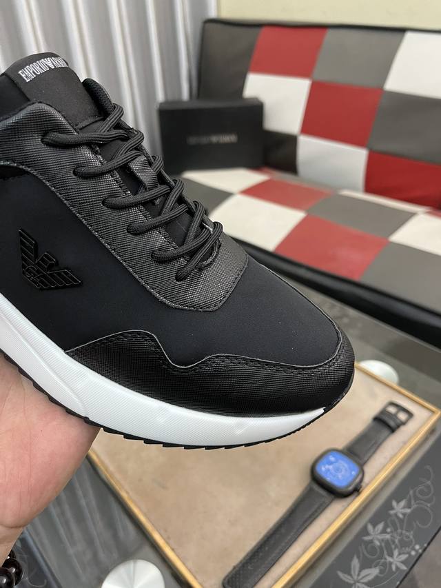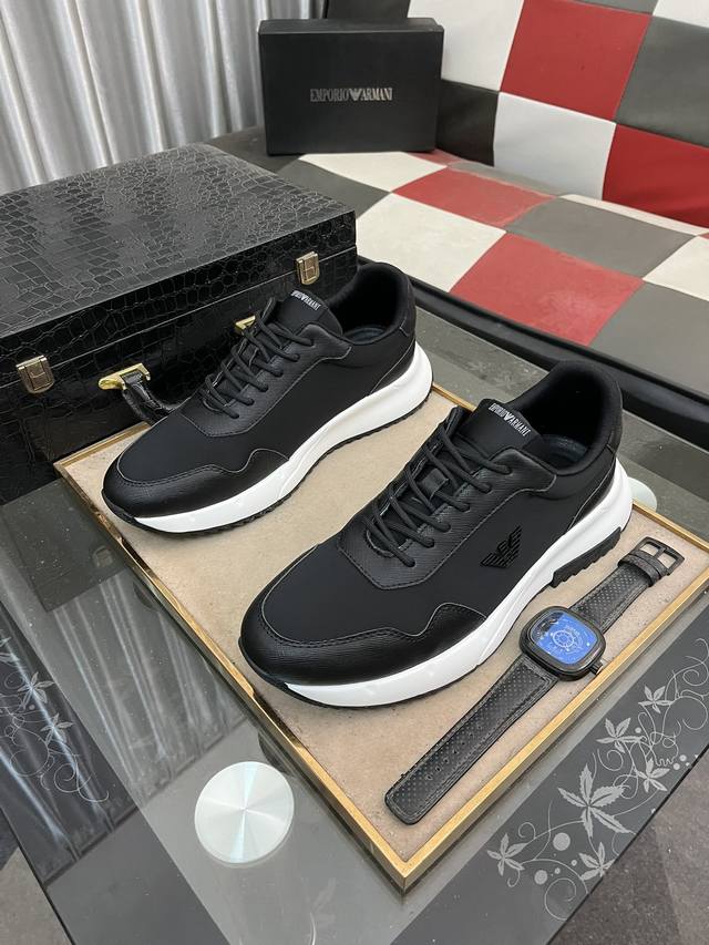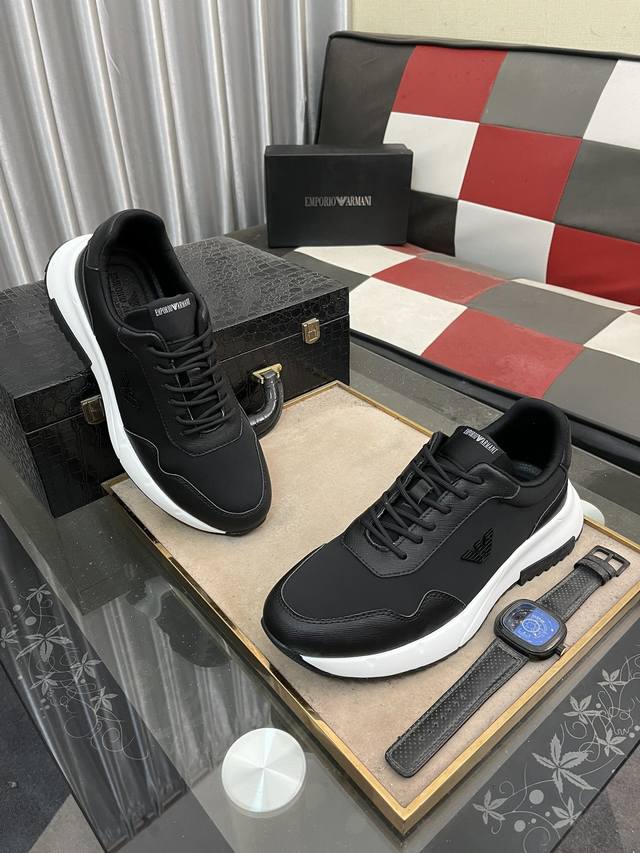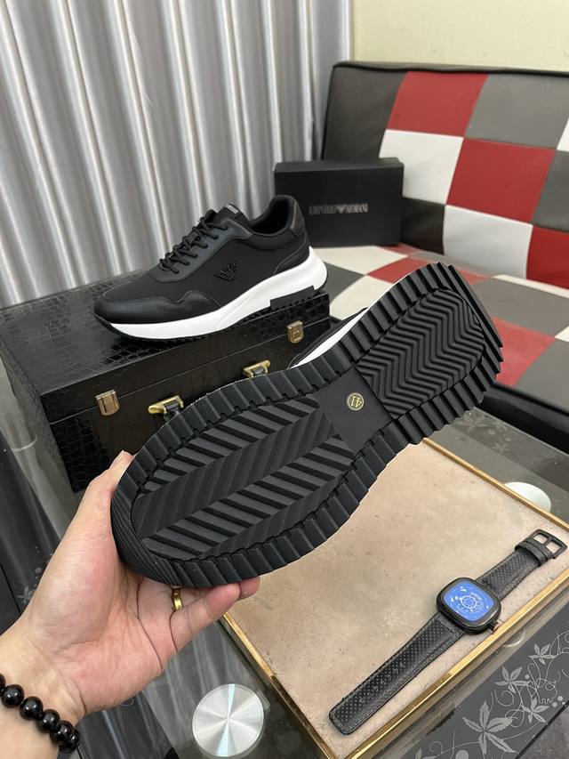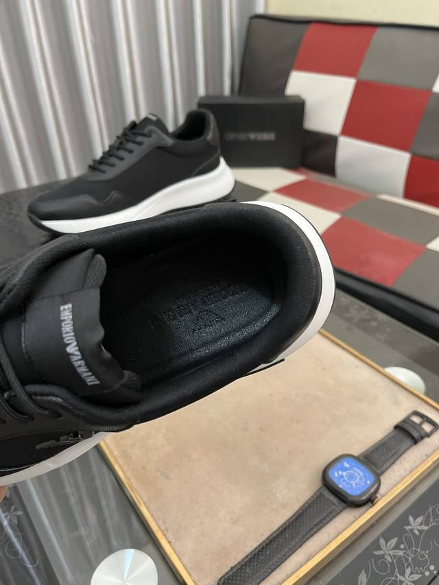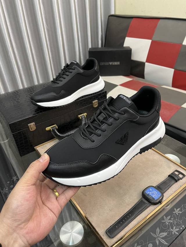 出厂价: 阿玛尼新款休闲运动鞋 时尚百搭, 版型简洁大气, 面料采用进口牛皮配原版布料,透气内里,原版耐磨橡胶大底,独家新款,实物拍摄,码数:38-443色可选