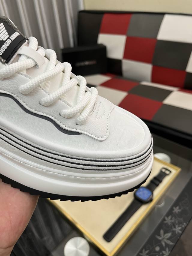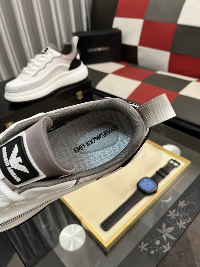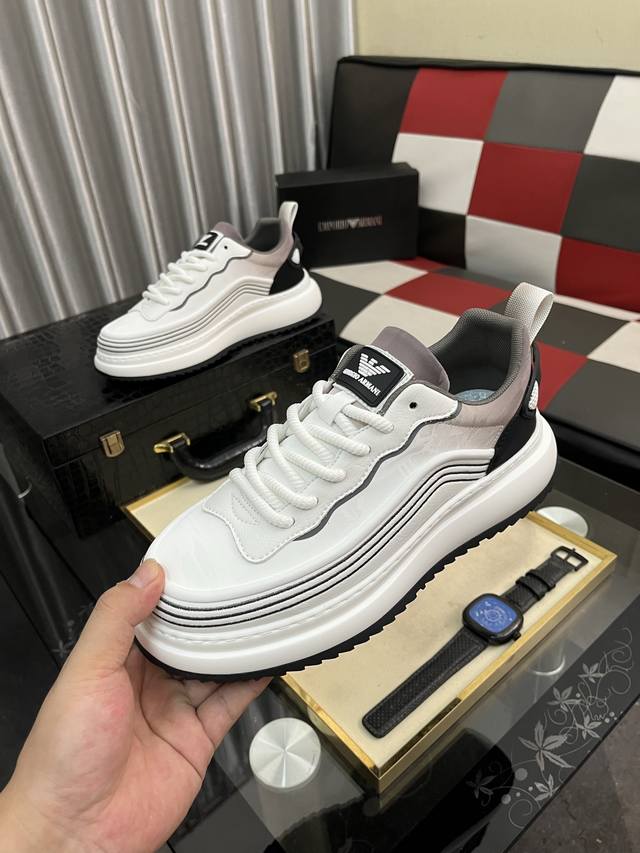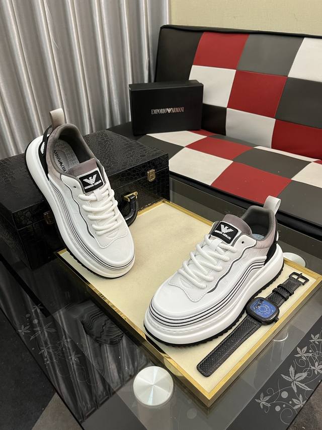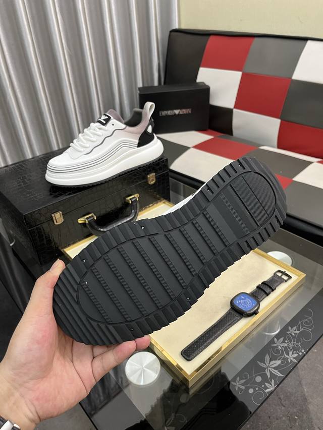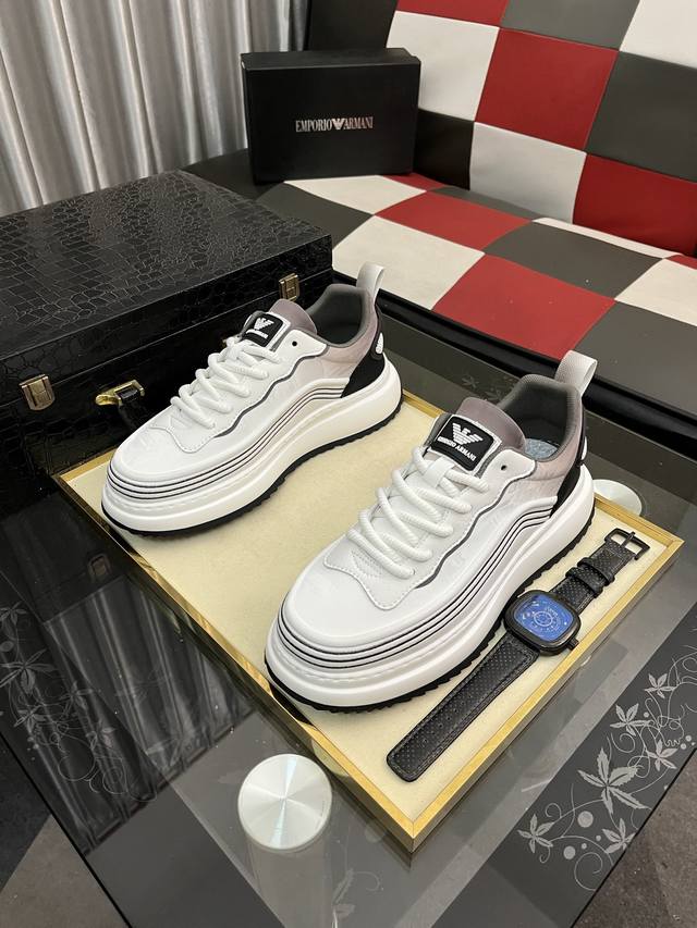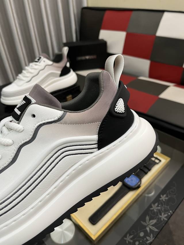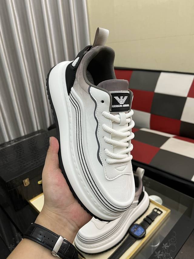 / 出厂价pp: 阿玛尼~独特现代风运动鞋。专柜代购休闲鞋 意大利进口原版皮 拒绝脱色磨脚 鞋底:原厂特供原版底,上脚轻盈,羊里,超酷 系带走路都带风风格设计 超舒