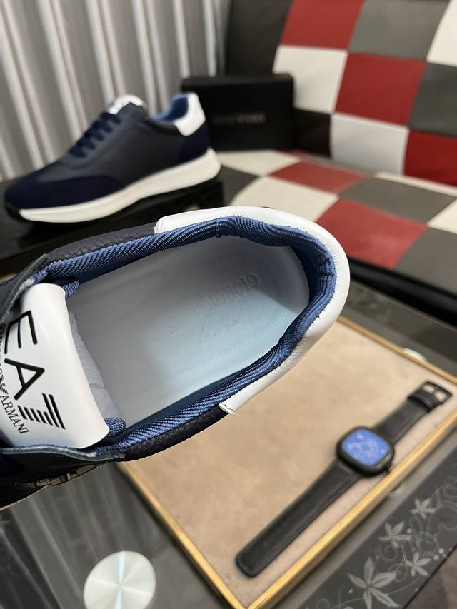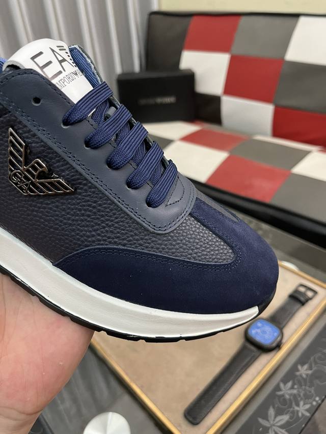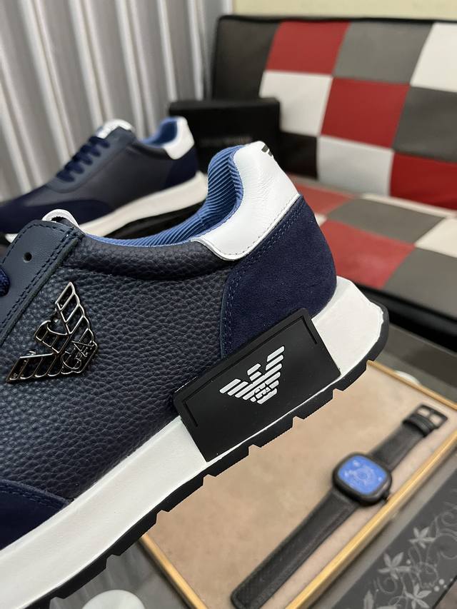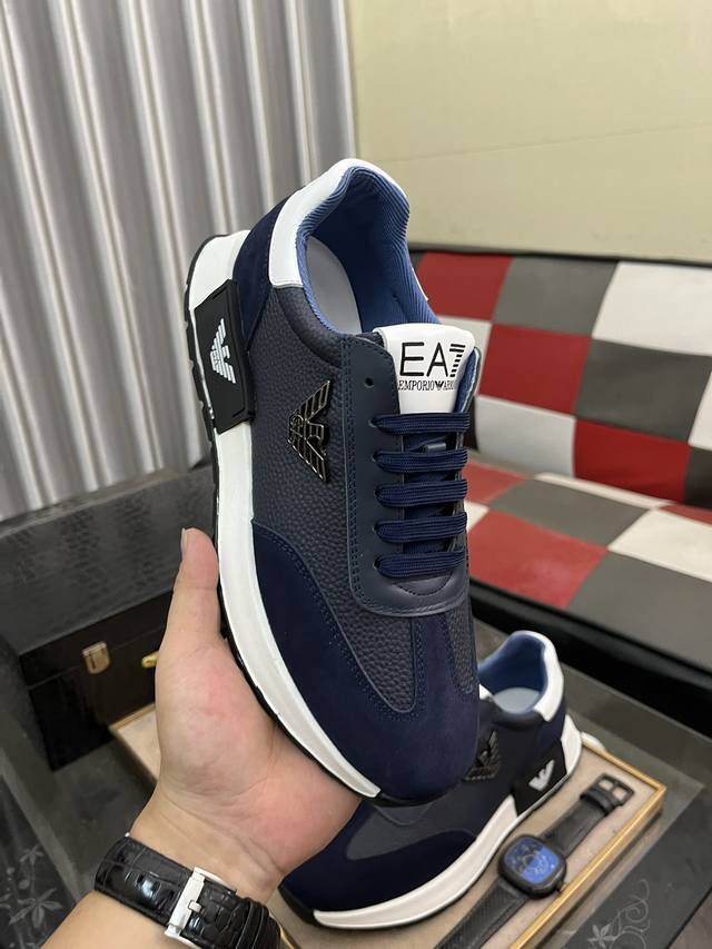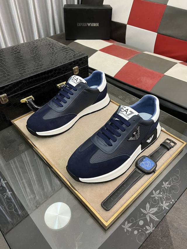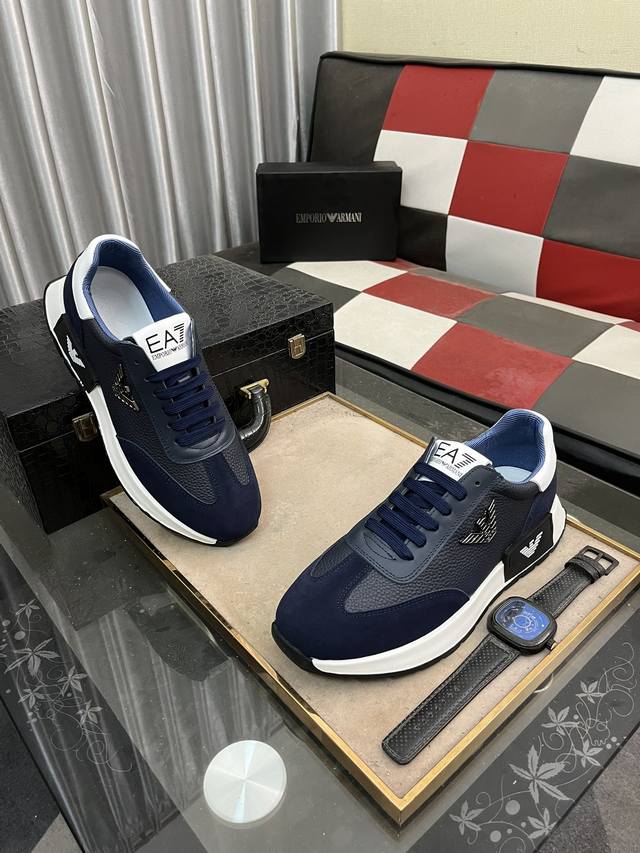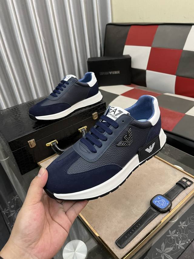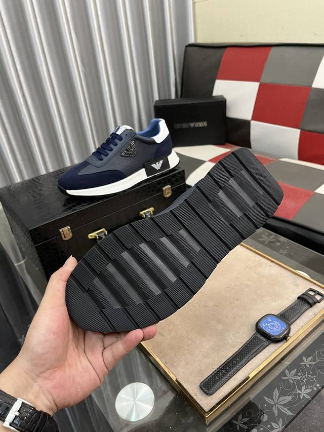 Armani 阿玛尼新款时尚男士运动鞋精心打造国际品牌 此款休闲鞋集优质面料与精湛工艺于一身,鞋面选用头层牛皮!透气网布内里羊皮垫脚。上脚效果帅气有型,轻质T