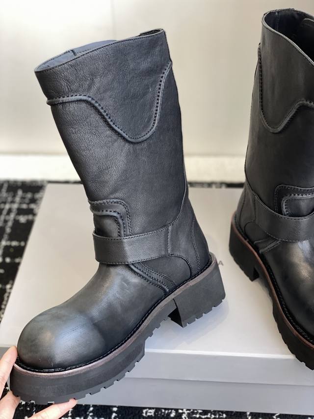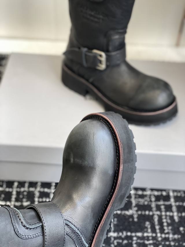 请认准高版本 这款靴子在设计上独具匠心 以绑带与皮带元素作为亮点 不仅能将靴子稳固贴合于足部 更可随心调节松紧 在细节处理上 品牌标志性的做旧五金件贯穿始终 巧妙营造出复古磨损效果,彰显个性态度搭配厚实的齿状橡胶鞋底 既保证了穿着的舒适度,又强化了整体的时尚感与辦识度Venom高筒靴无疑是本季不容错过的时尚单品,它将为时尚爱好者们的穿搭增添别样魅力,引领新一轮的潮流风尚 靴筒高度
