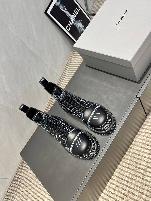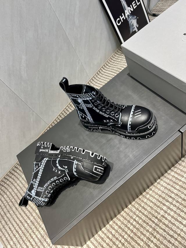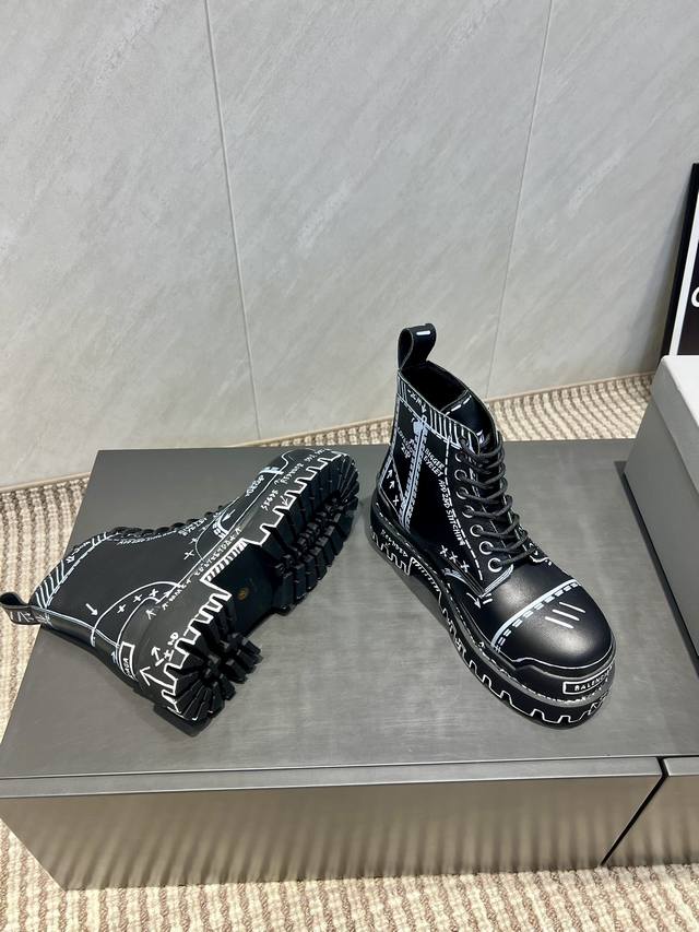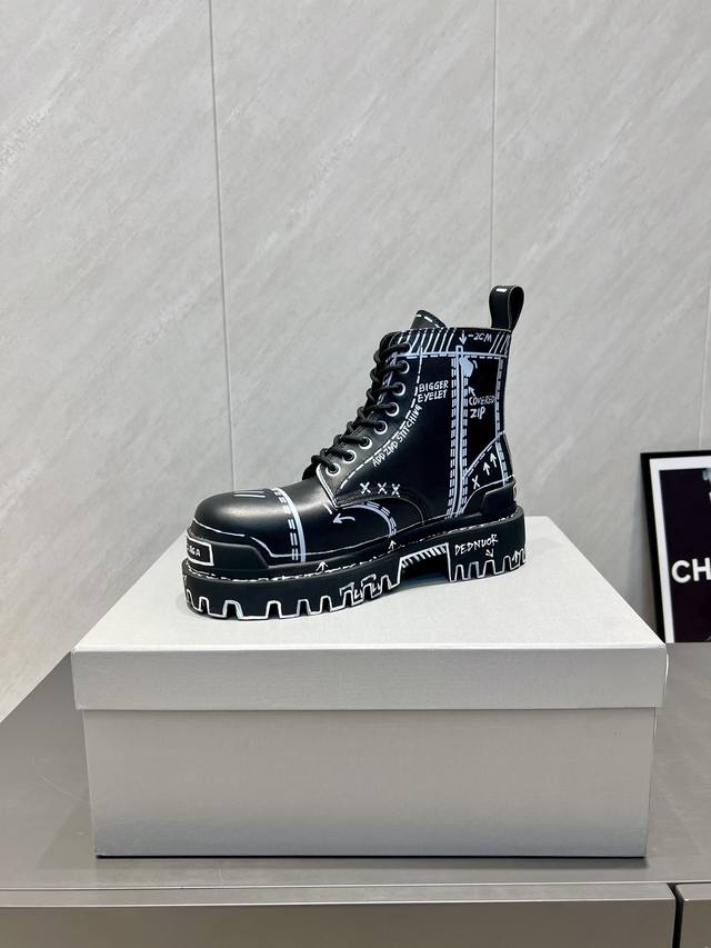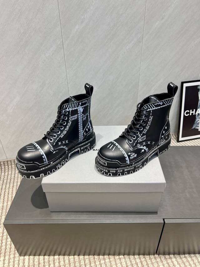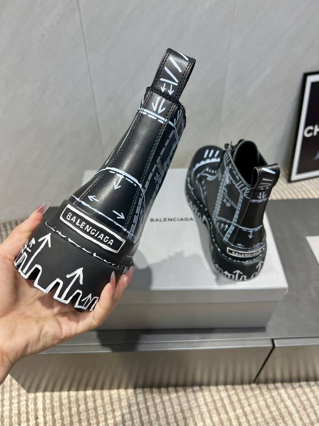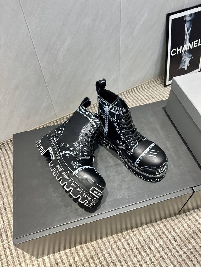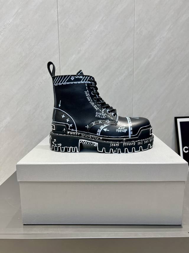 出厂:情侣涂鸦款 独家顶级版本 Balenciag*巴黎世*家2025Vs秋冬情侣新款靴子系列 情侣复古涂鸦短靴 巴黎世家今年又出战靴!胖嘟嘟大头这么可爱啊!黑