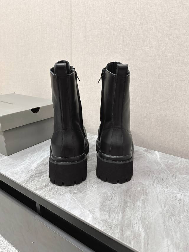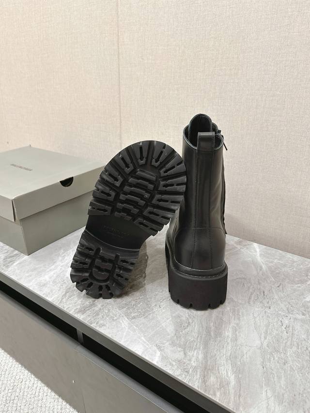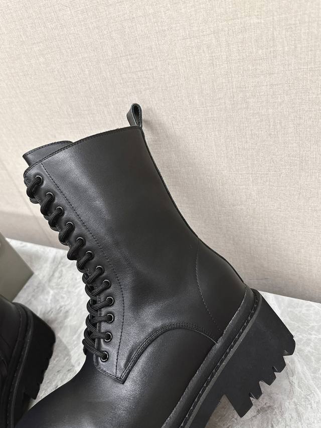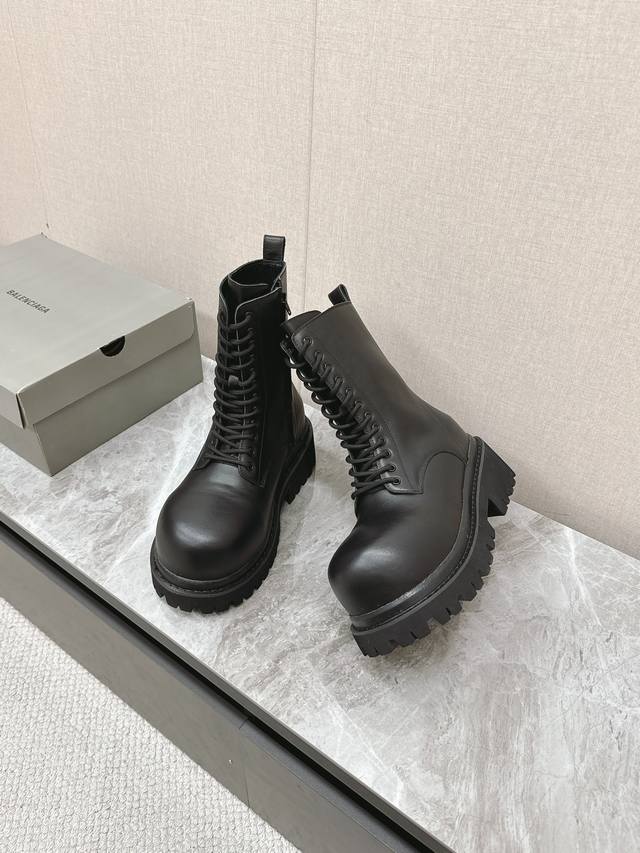 巴黎世家balenciaga春夏秀款情侣大头皮鞋 巴家就一直在引领大鞋大靴的风潮:破坏帆布鞋面的strike军靴,成为不少潮人kol“人脚一双”的必备单品;类固醇米奇德比,虽然刑具但必须上脚成为时尚人的执着;本该出现在雪场的厚重无比的滑雪靴,被大家搭配上了各种宽松的迷彩 工装裤 所以在这双出来的时候其实大家有惊喜但会感觉没有超出预期,因为这双stomper Boots的鞋身和鞋底与strike军靴基本上无二致,鞋头部分则借用皮质还原了米奇德比的夸张大翘头,使得这双鞋子在质感上有了质的提升,又兼具了实穿性,