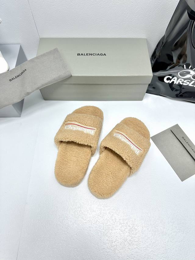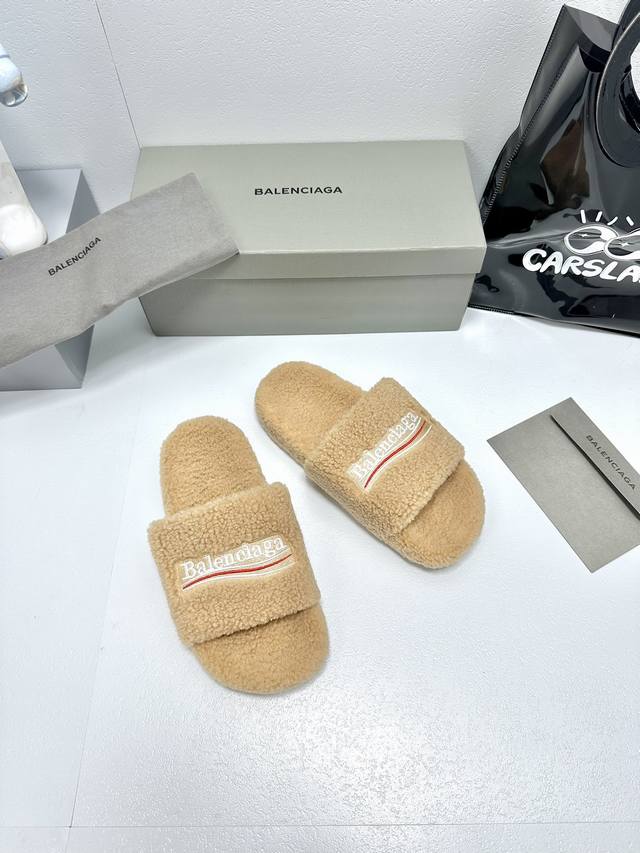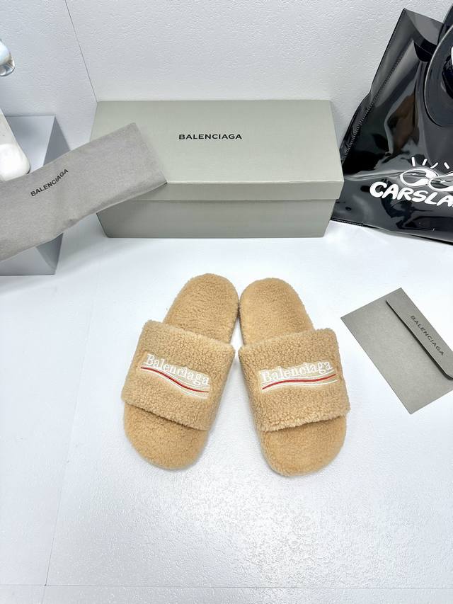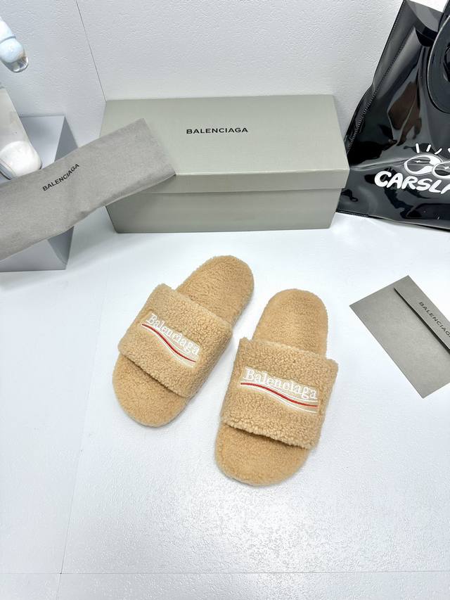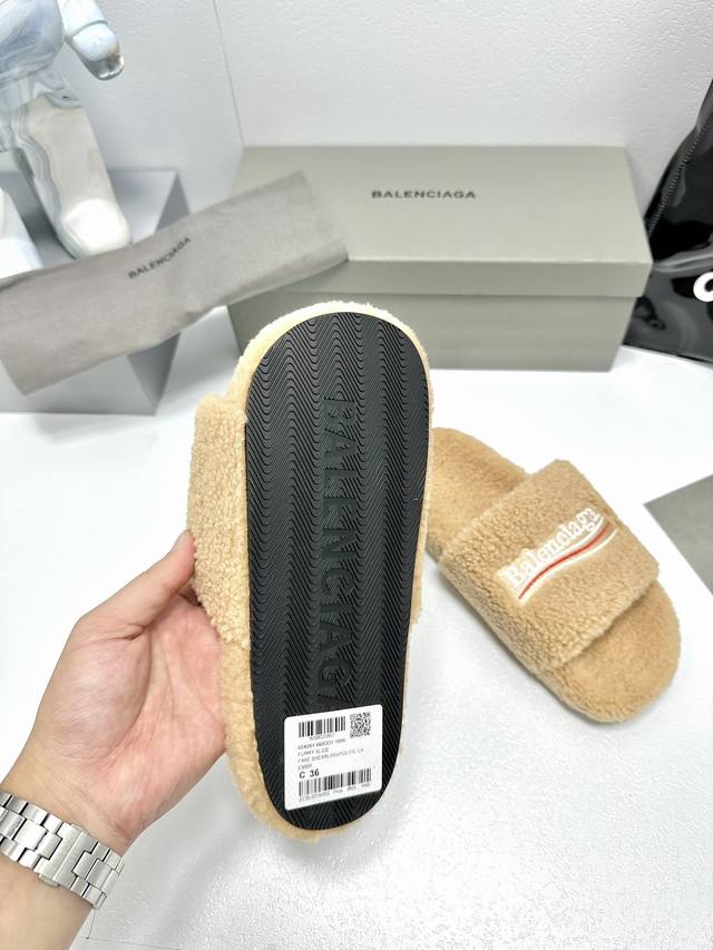 S 巴黎世家秋冬潮品 羊羔毛毛拖 ! Balenciaga Political Campaign 徽标刺绣! 欧美名媛 明星 网红girl 大爱款 精致鞋面手工缝纫走线 蓬松柔软 亲肤柔软冬季必备款 时尚却不过分张扬 原版天然橡胶防滑耐磨大底 Size:35-45