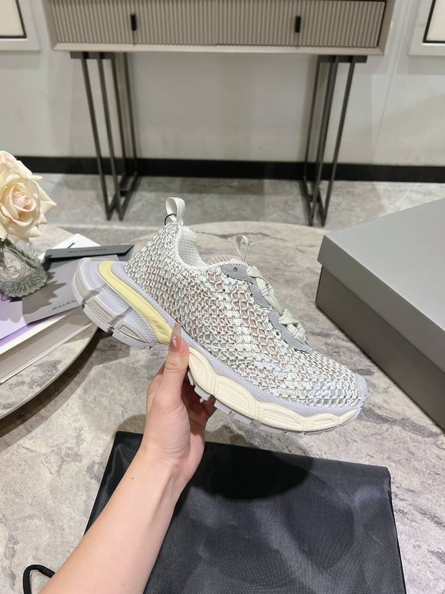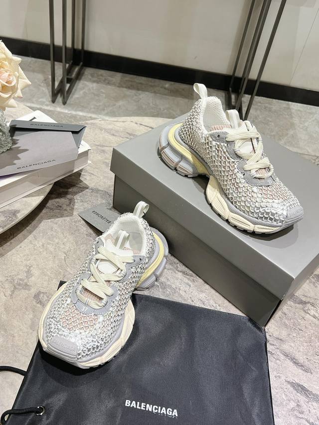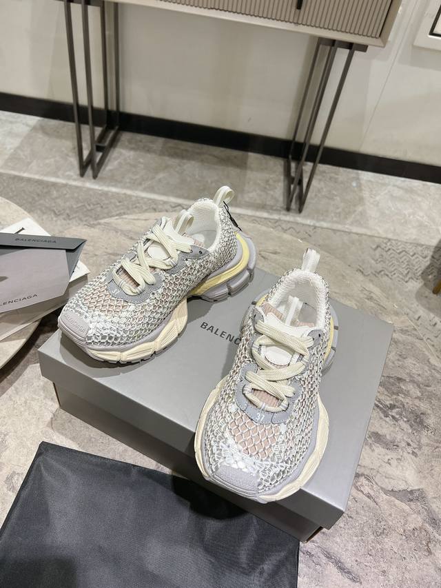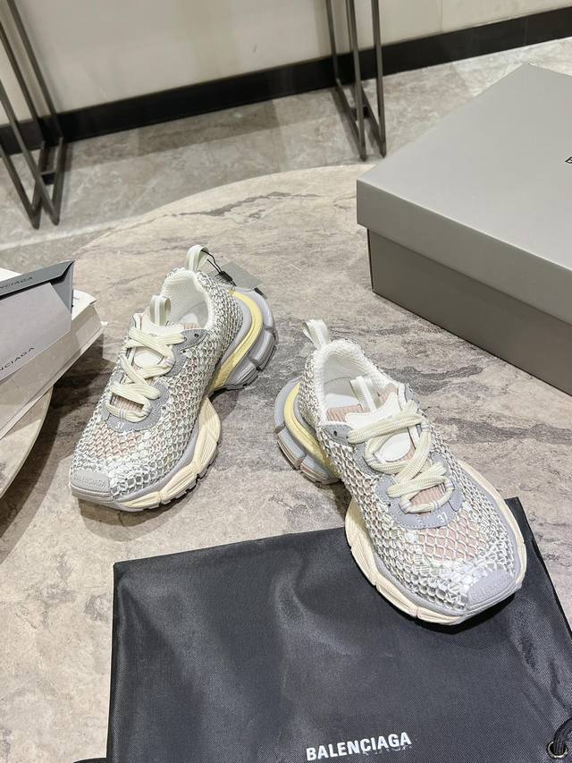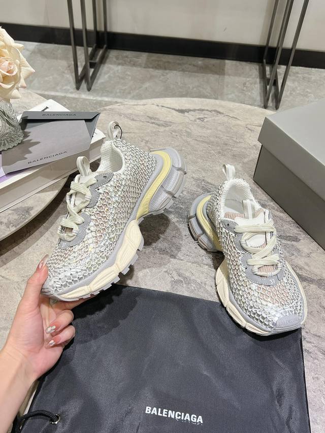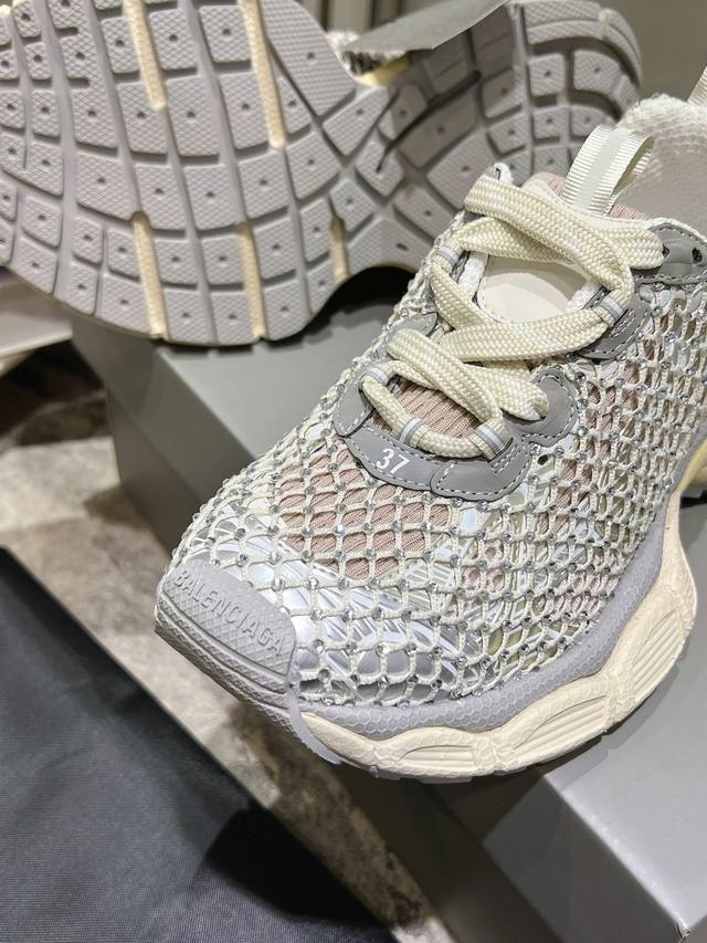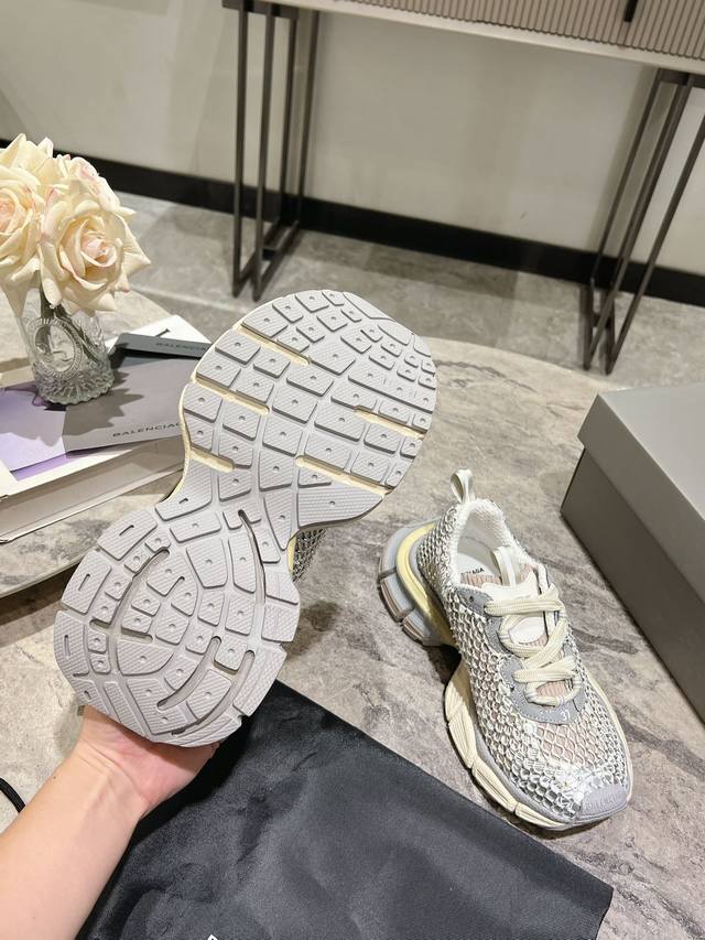 原版rmb12330购入开发 做货 Balenciaga 3Xl Sneaker 整体鞋型汲取了balenciaga Track和balenciaga Runner两款鞋型的创作思路 相当于把 Track鞋身的外框拆了下来 同时继承了 Runner的流线造型和 Track扁平的鞋头。在鞋面全身加了网纱钻 Bingbing超级闪