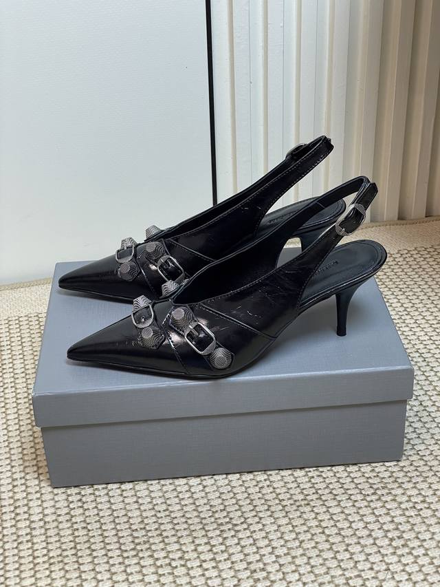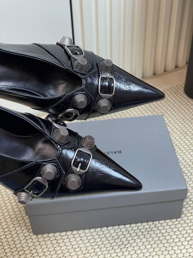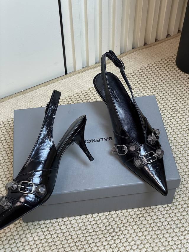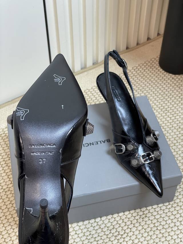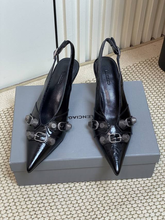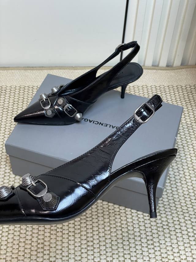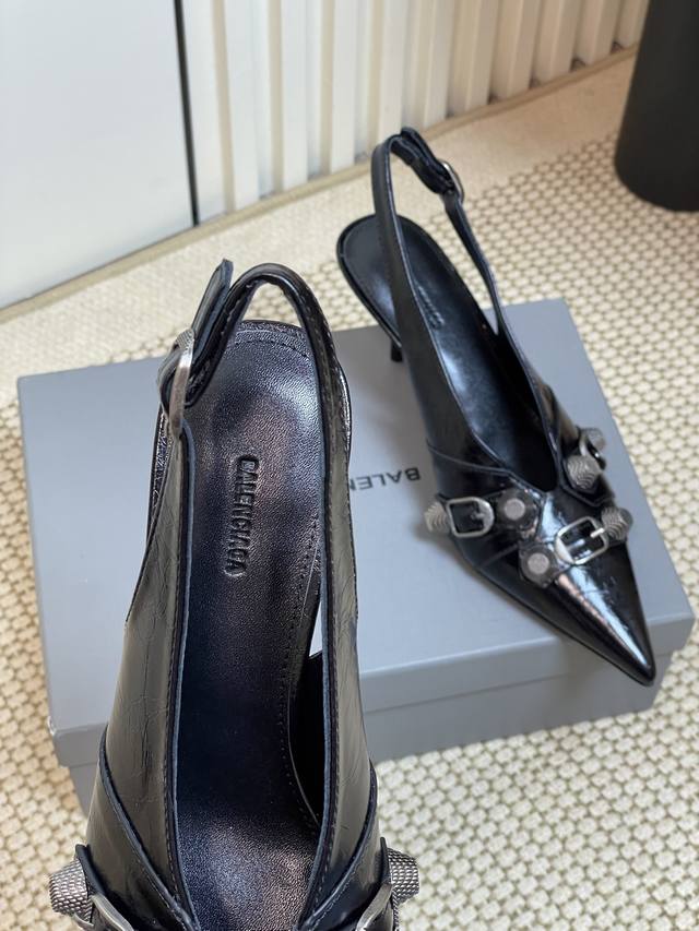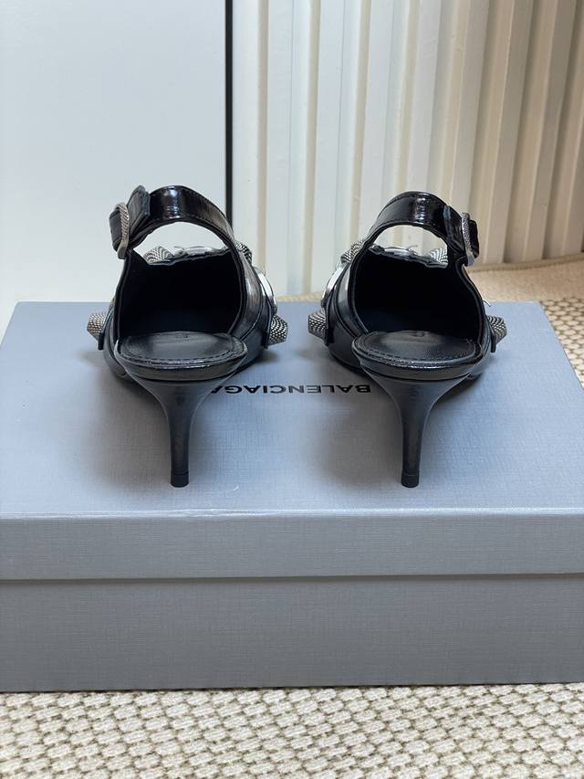 25Ss春夏新款Balenciaga金属铆钉机车朋克风尖头高跟单鞋 后空凉鞋