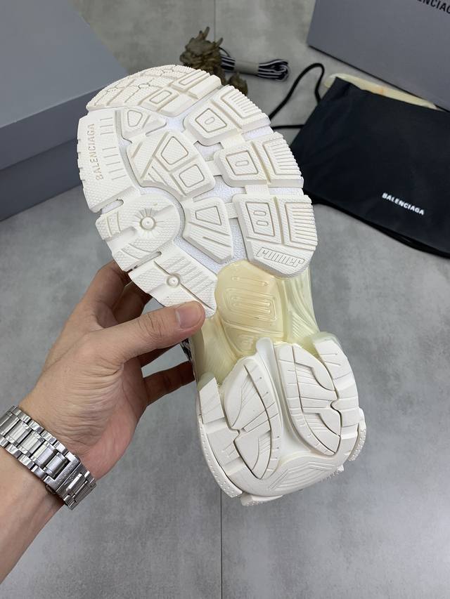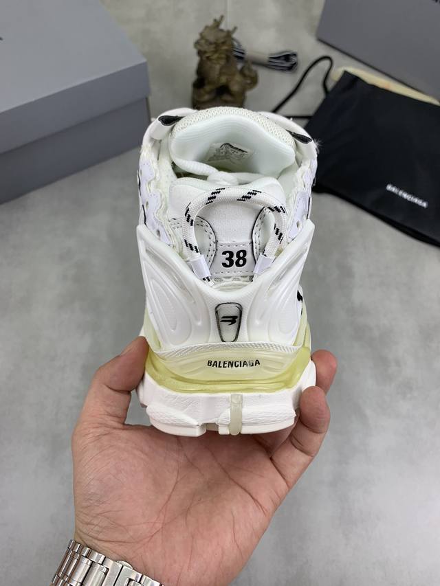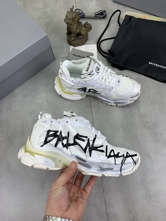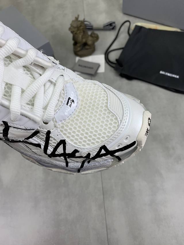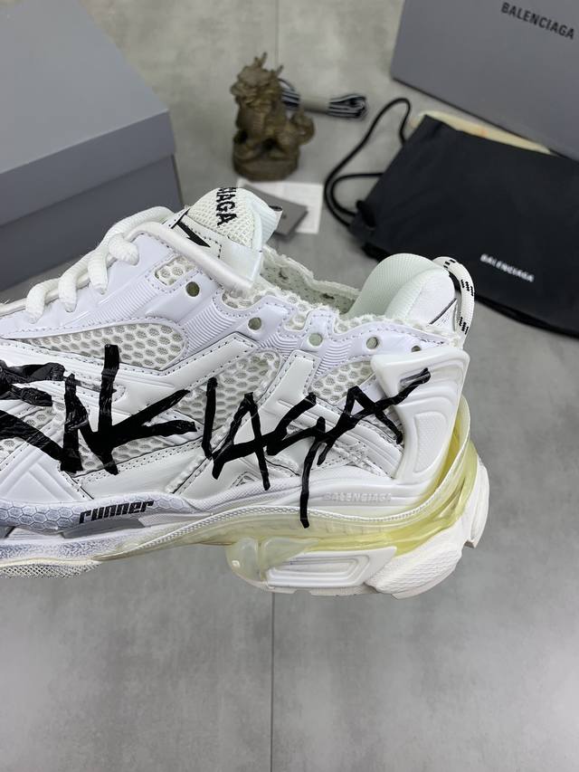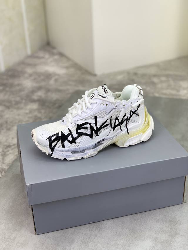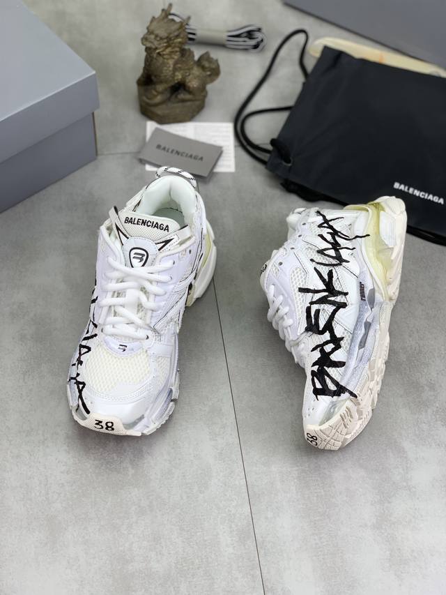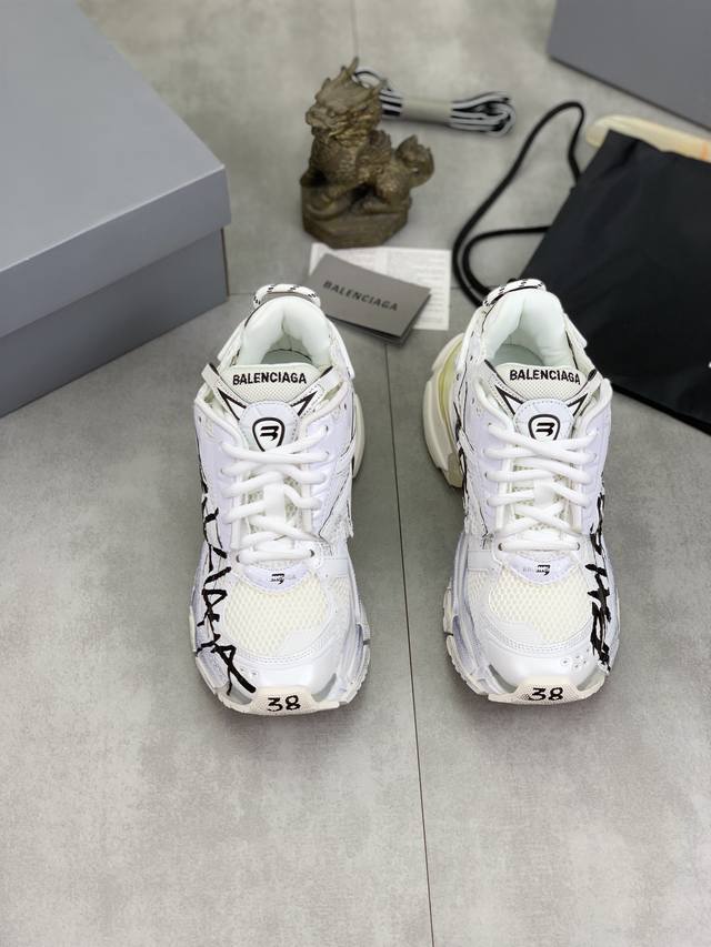 不含皮运动鞋,网布材质,磨损效果,鞋头边缘印有尺码,背面浮印尺码,外侧印有跑者徽标,鞋舌刺绣Balenciaga品牌标识,鞋跟背面Balenciaga品牌标识,材质采用70%聚氨酯、30%聚酯纤维。