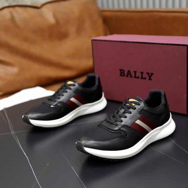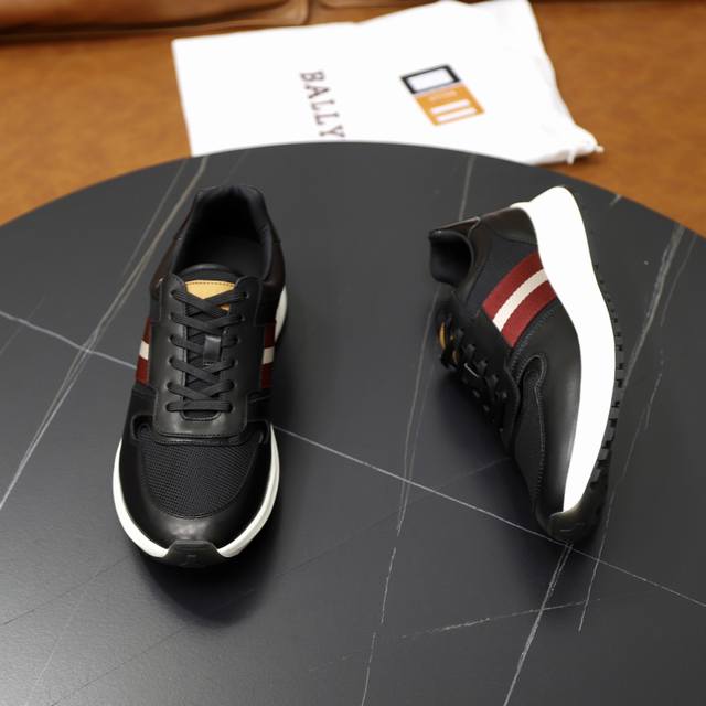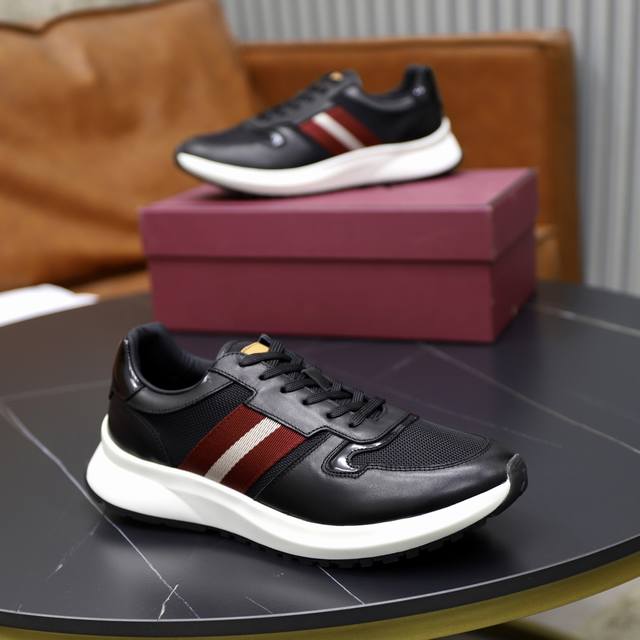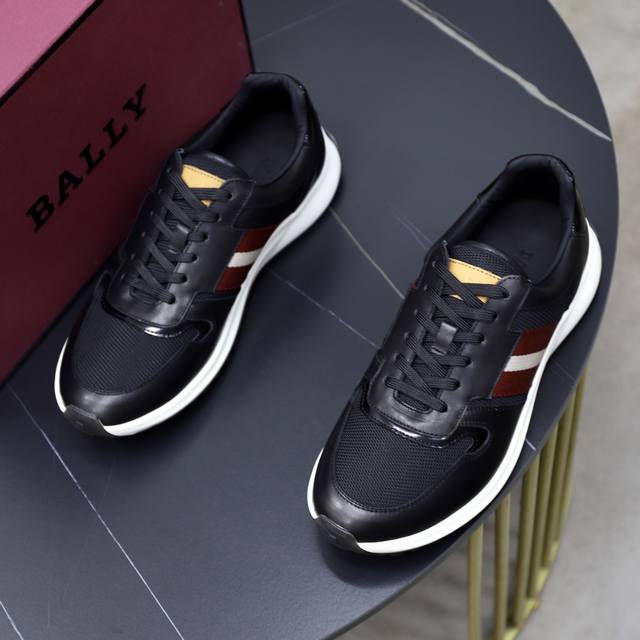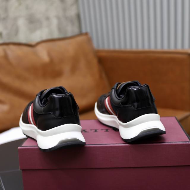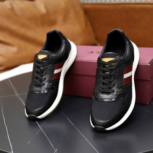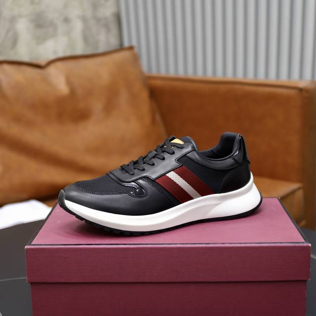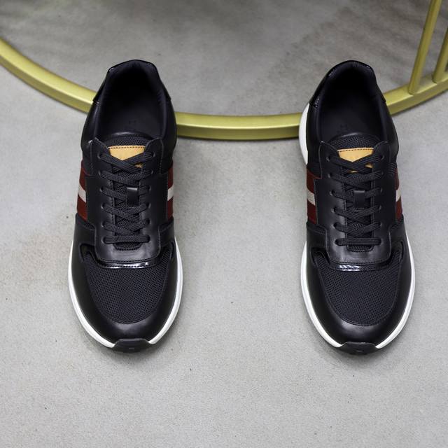 原厂小牛皮面拼接纯色网布设计风格 舒适透气效果极好 经典的B家红白条纹织带徽章装饰 饰以“Bally”银色字母Logo点缀 个性十足 辨识度极高 配牛皮垫脚 撞色橡胶鞋底 上脚极度舒适 质感可见 轻便舒适