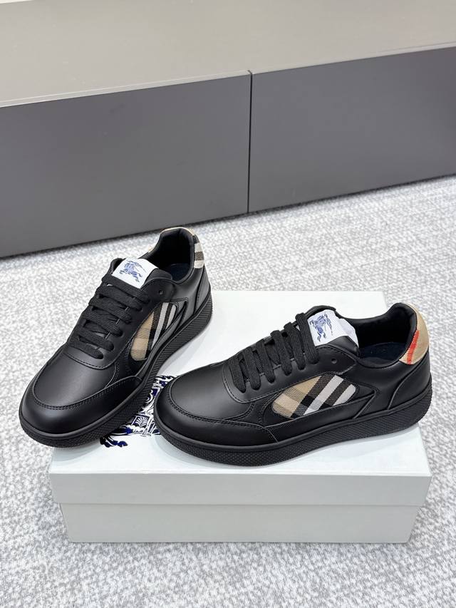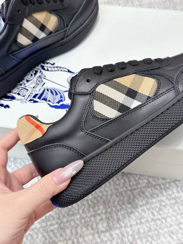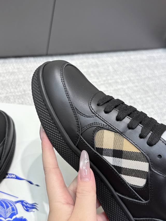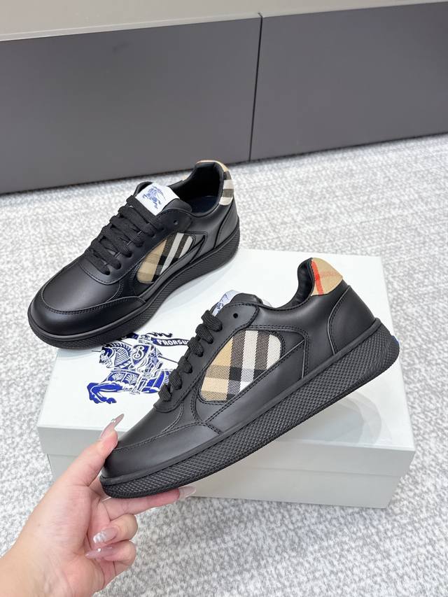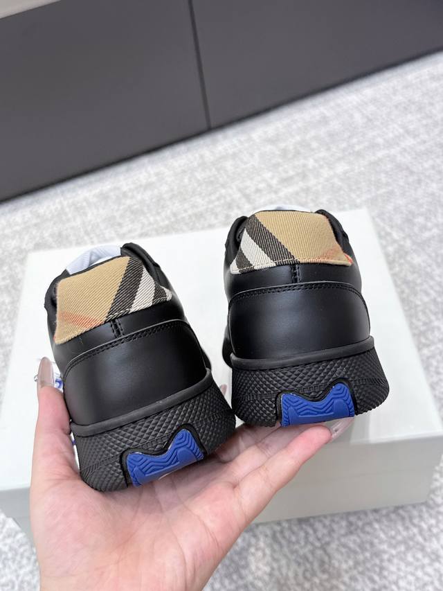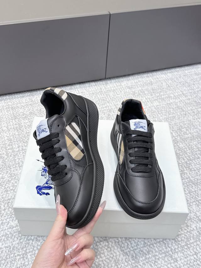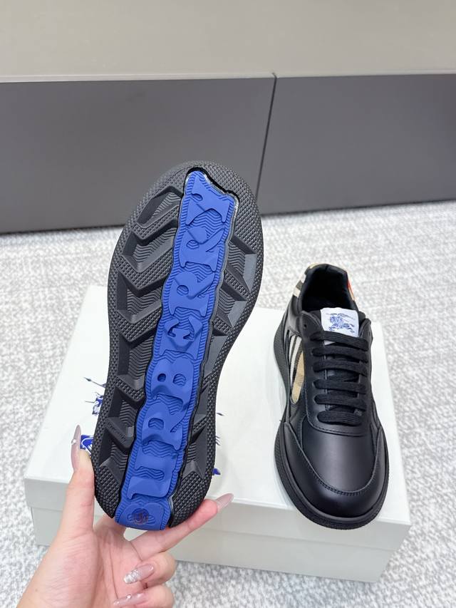 原版购入开发 做货 Box系列运动鞋 选用光滑小牛皮面料打造,点缀马术骑士徽标 Ekd 压花。采用网眼内衬,鞋带融入金属线圈装饰,橡胶鞋底饰有典藏 Burberry 字母徽标