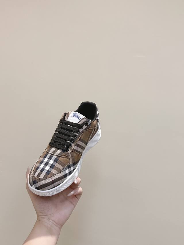 原版购入开发 做货 Box系列运动鞋 选用光滑小牛皮面料打造,点缀马术骑士徽标 Ekd 压花。采用网眼内衬,鞋带融入金属线圈装饰,橡胶鞋底饰有典藏 Burberry 字母徽标