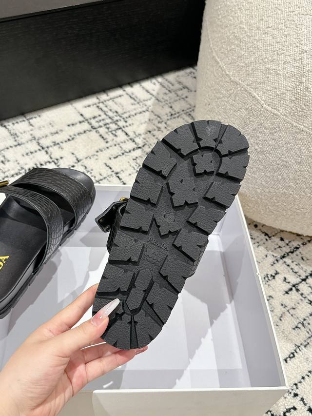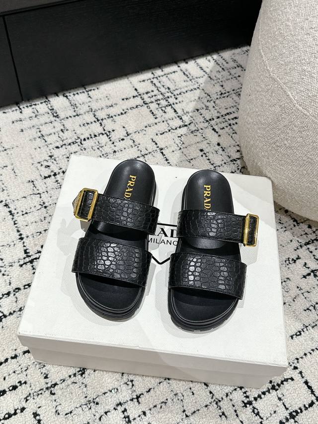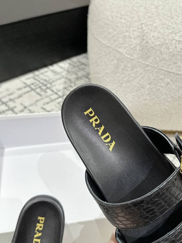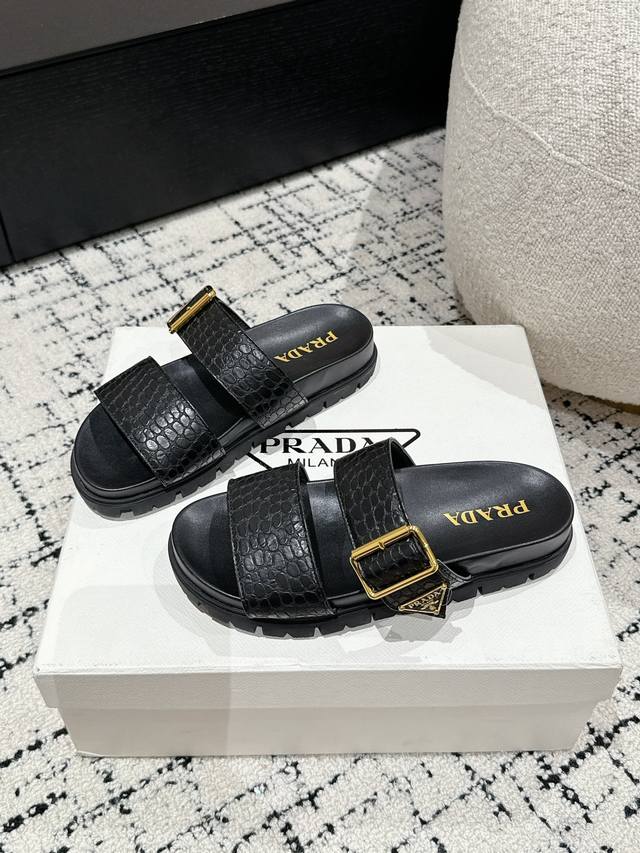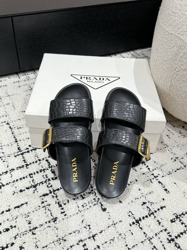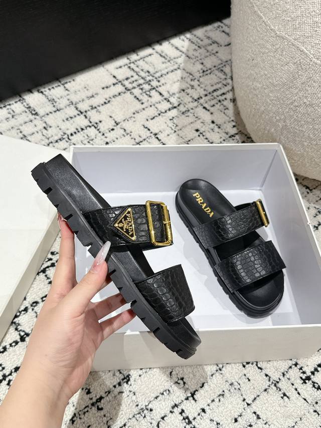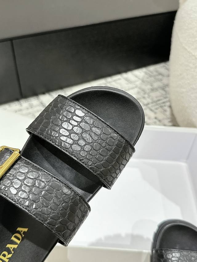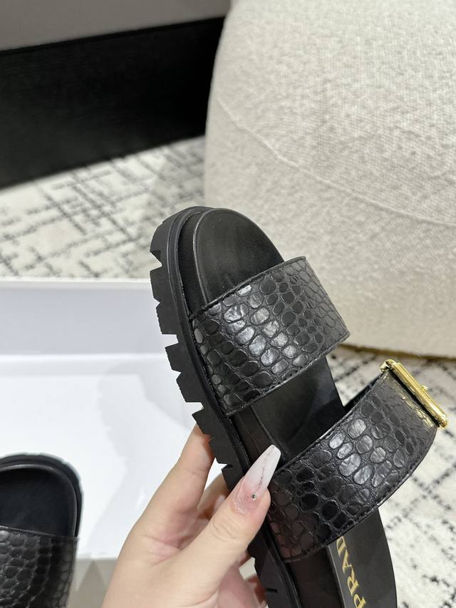 新款普拉达牛皮压印石头纹面料拖鞋,鞋型非常秀气且不软榻,脚感相当舒服 随意穿搭