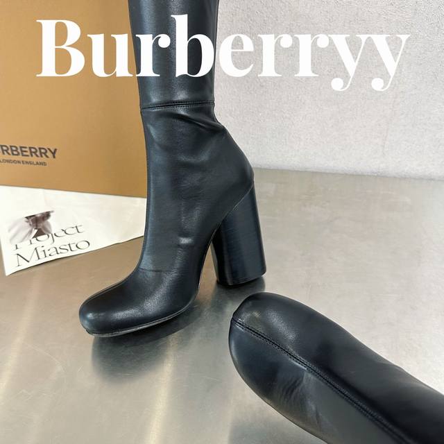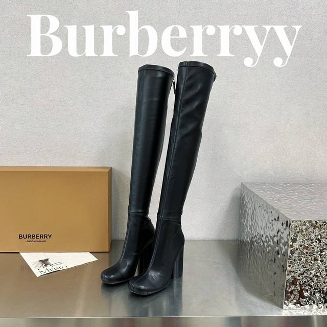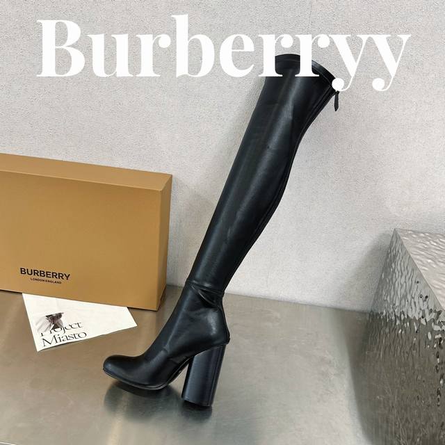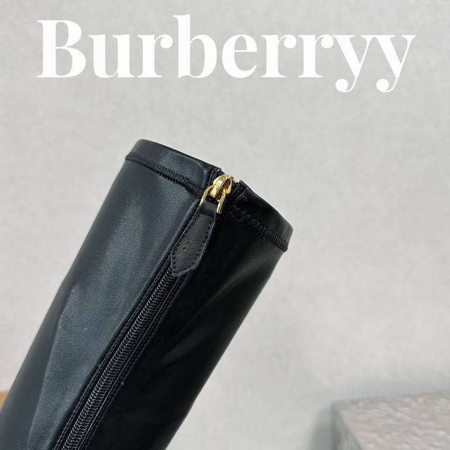 Burberry博柏利英国奢侈品牌,原版1:1复制,贴身弹力及膝靴,设计圆形靴头粗跟,装饰品牌标志图案。