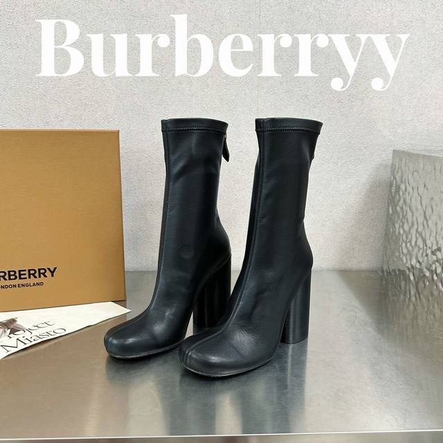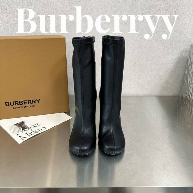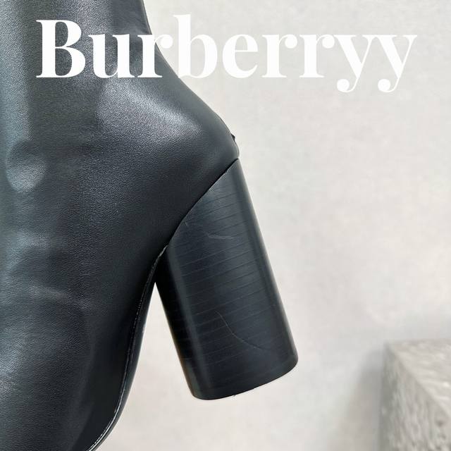 Burberry博柏利英国奢侈品牌,原版1:1复制,贴身弹力及膝靴,设计圆形靴头粗跟,装饰品牌标志图案。