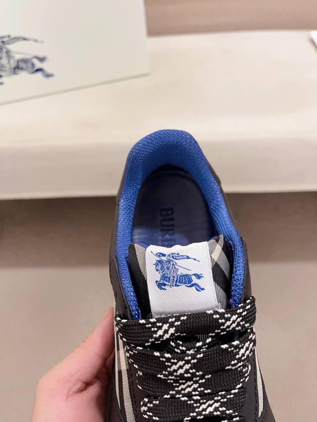 / 工厂价: 顶级版本新款巴宝莉家男士经典低帮运动鞋,以 Vintage 复古格纹棉材质搭配小牛皮焕新演绎,装饰焕新的品牌徽标。头层牛皮内里,鞋跟饰有 Burber