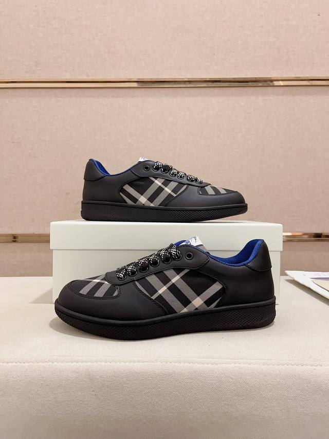 工厂价: 顶级版本新款巴宝莉家男士经典低帮运动鞋,以 Vintage 复古格纹棉材质搭配小牛皮焕新演绎,装饰焕新的品牌徽标。头层牛皮内里,鞋跟饰有 Burberry 字母压花徽标,Tpu原版大底!码数:38-45。可定做女码和46。