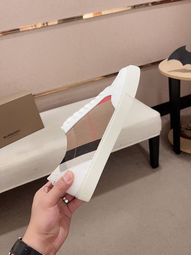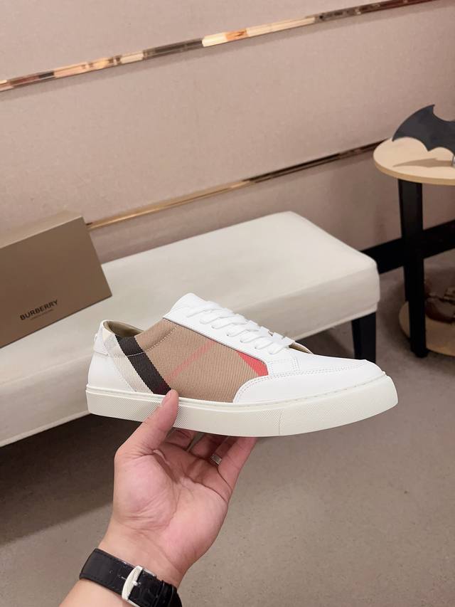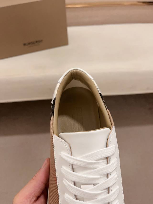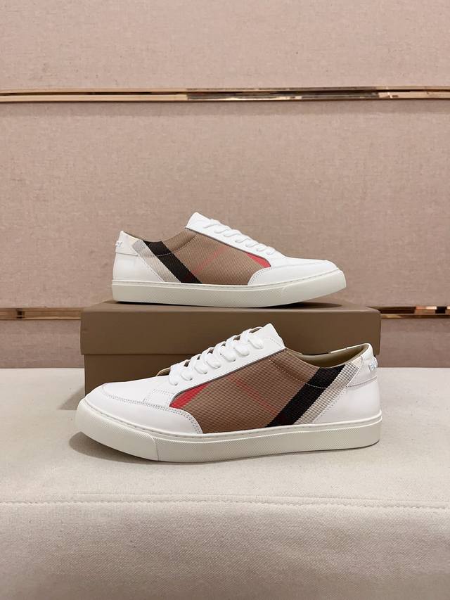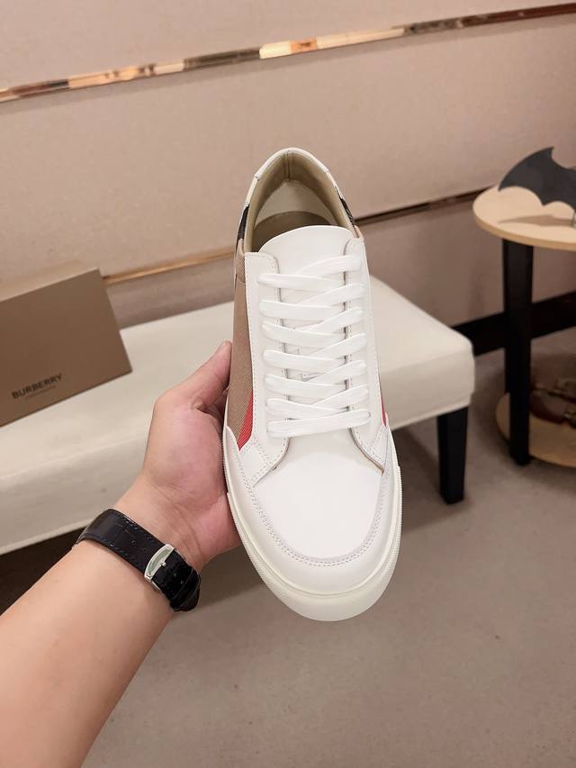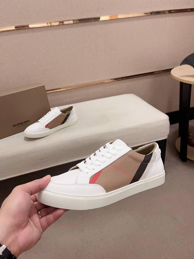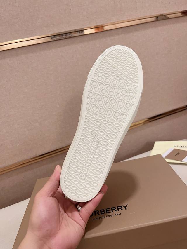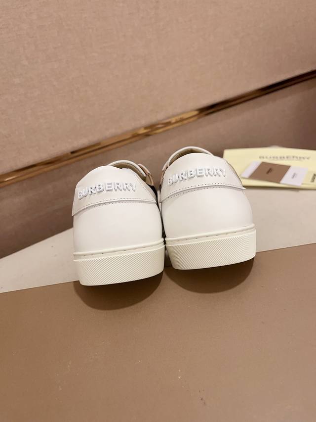工厂价: 顶级版本新款巴宝莉家男士经典低帮运动鞋,以 Vintage 小牛皮焕新演绎,装饰焕新的品牌徽标。头层牛皮内里,鞋跟饰有 Burberry 字母压花徽标,Tpu原版大底!码数:38-44。可定做45