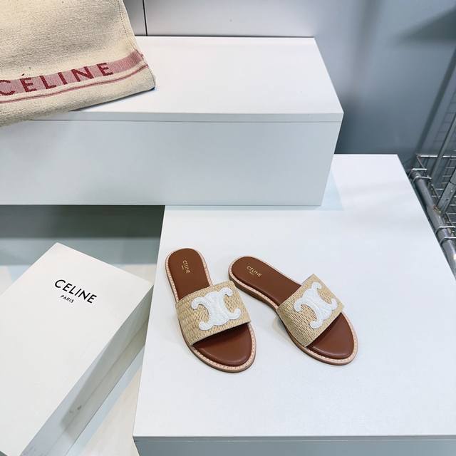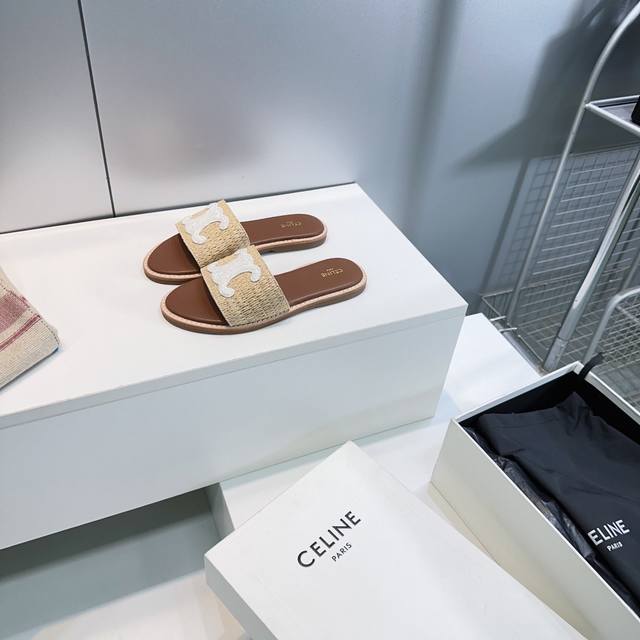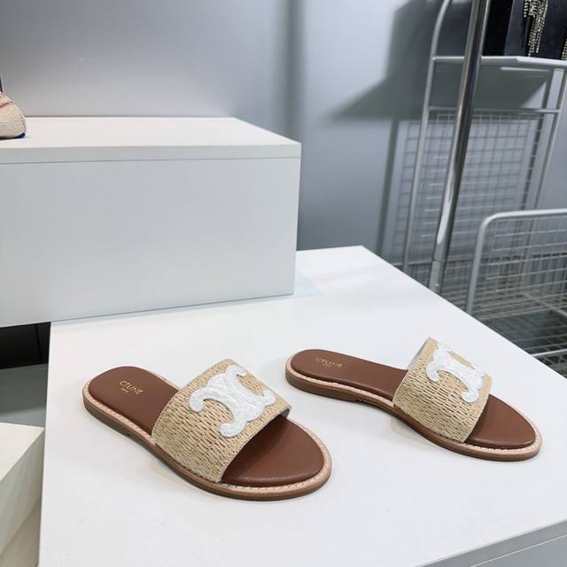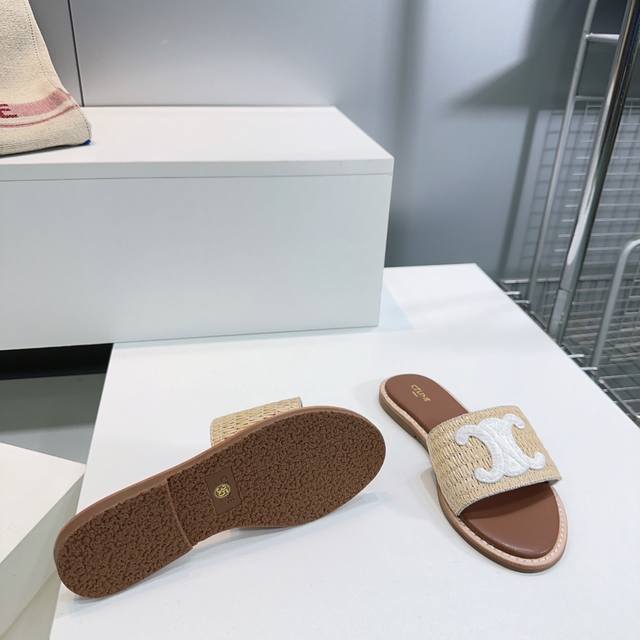 25春夏季凯旋门新款简易草编休闲平底拖鞋 这一季的赛琳又让我重新爱了它一次 这季节美鞋太多!这款凉拖真是无敌好搭配!简约的设计搭配经典的Logo作为点缀整体视觉特别耐看又好搭配!