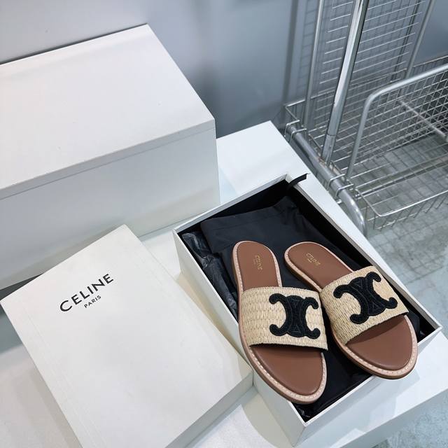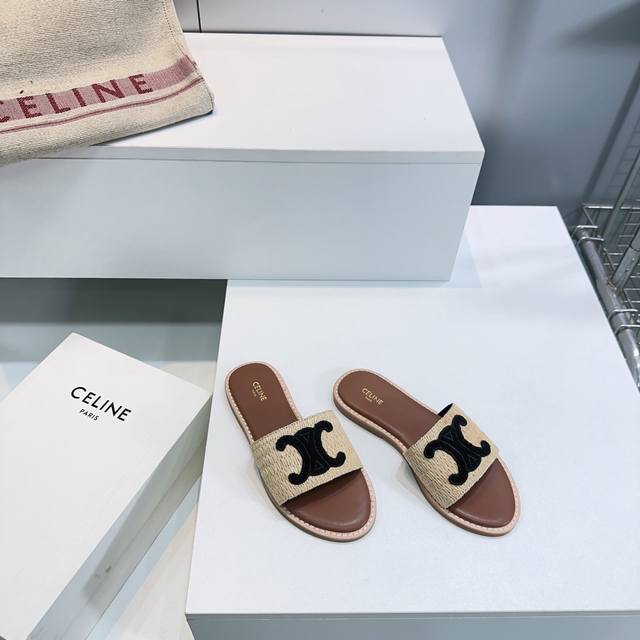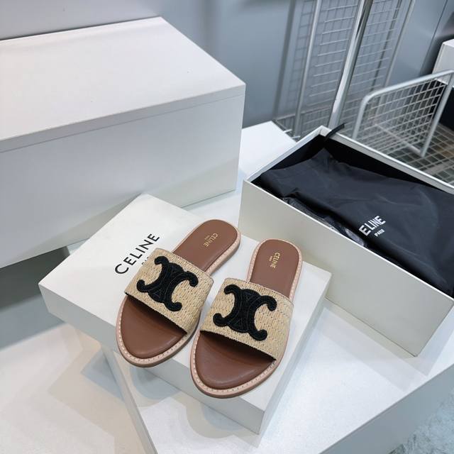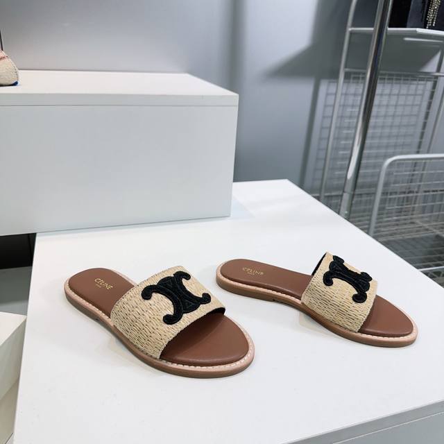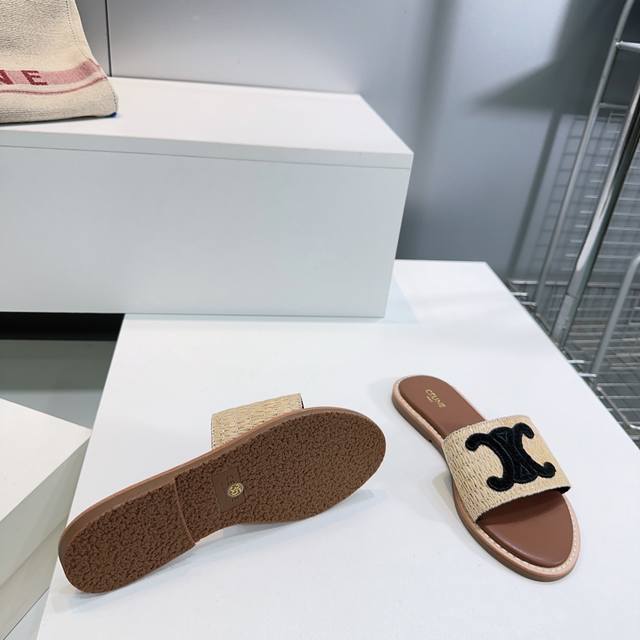 25春夏季凯旋门新款简易草编休闲平底拖鞋 这一季的赛琳又让我重新爱了它一次 这季节美鞋太多!这款凉拖真是无敌好搭配!简约的设计搭配经典的Logo作为点缀整体视觉特别耐看又好搭配!