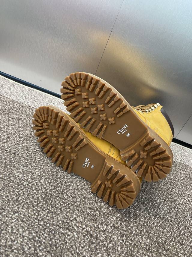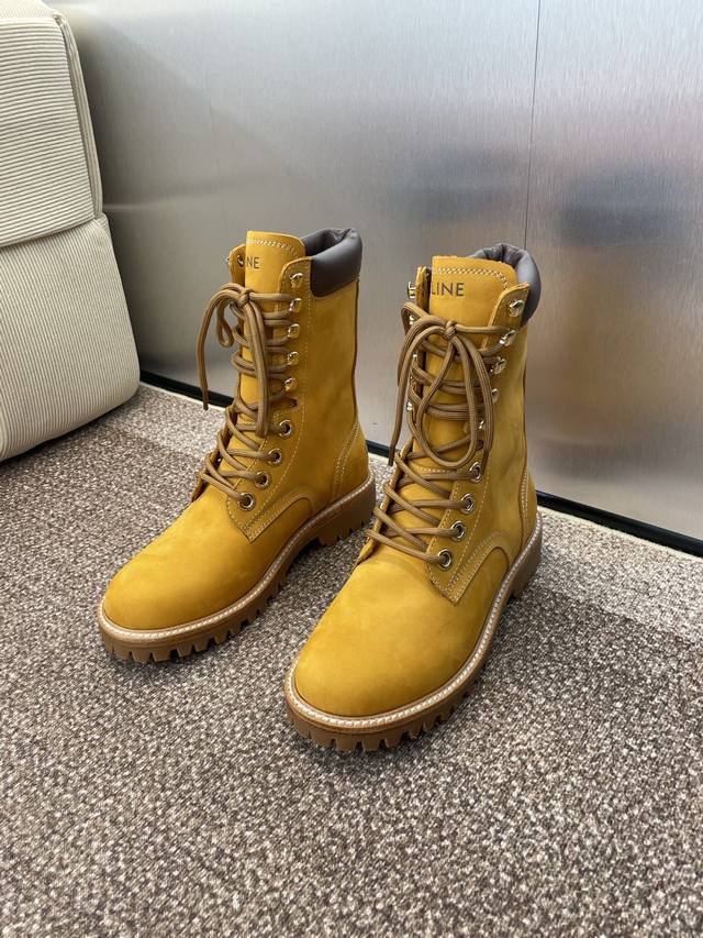 Celine 2025秋冬情侣新款低跟系带机车短靴 赛琳字母Logo拼色休闲骑士登山靴