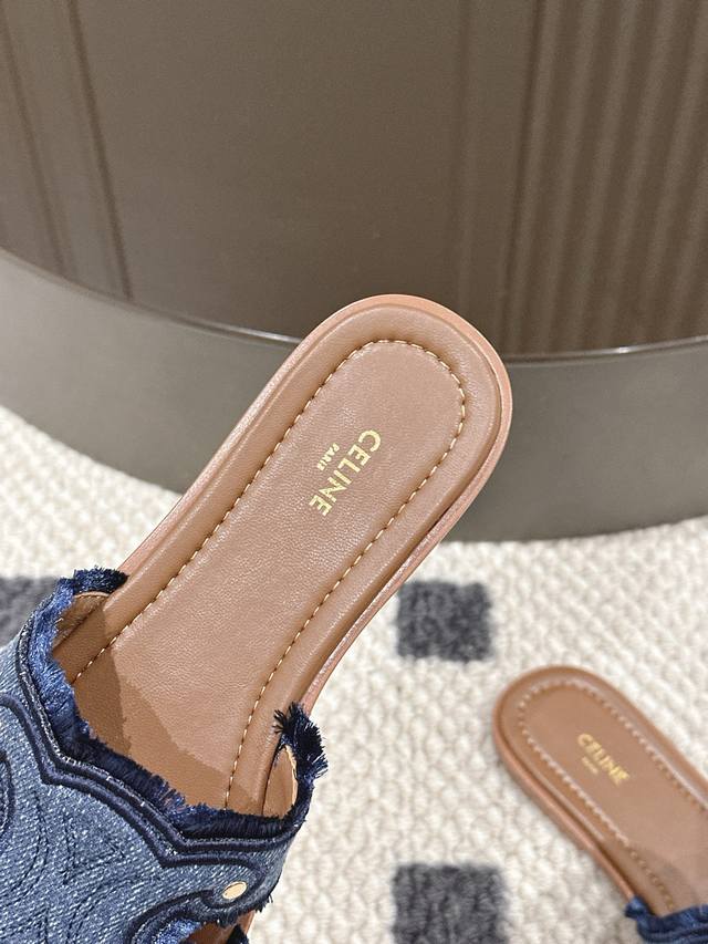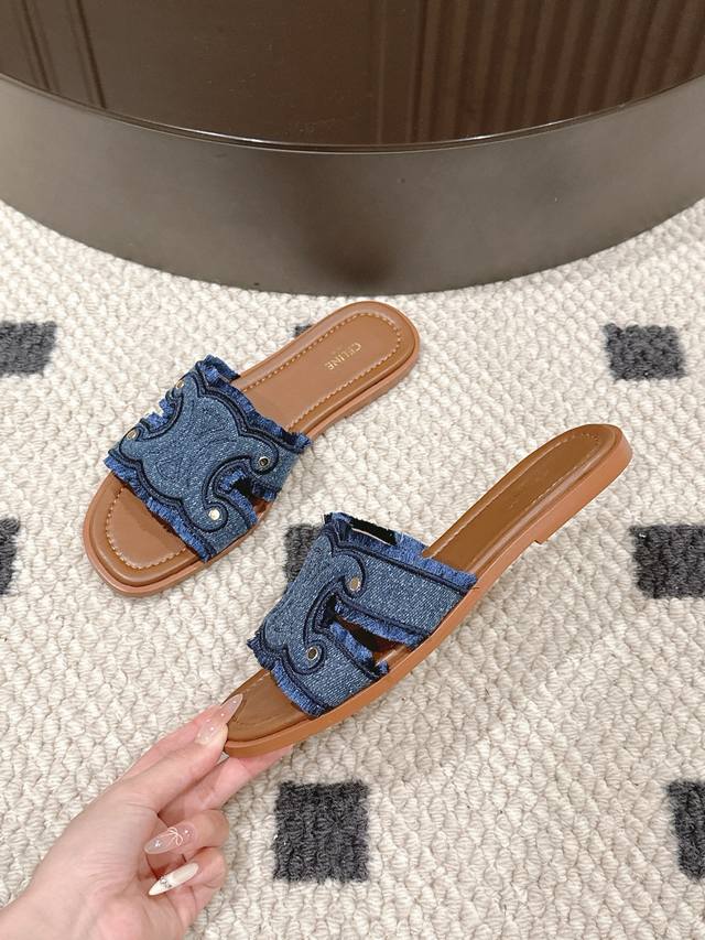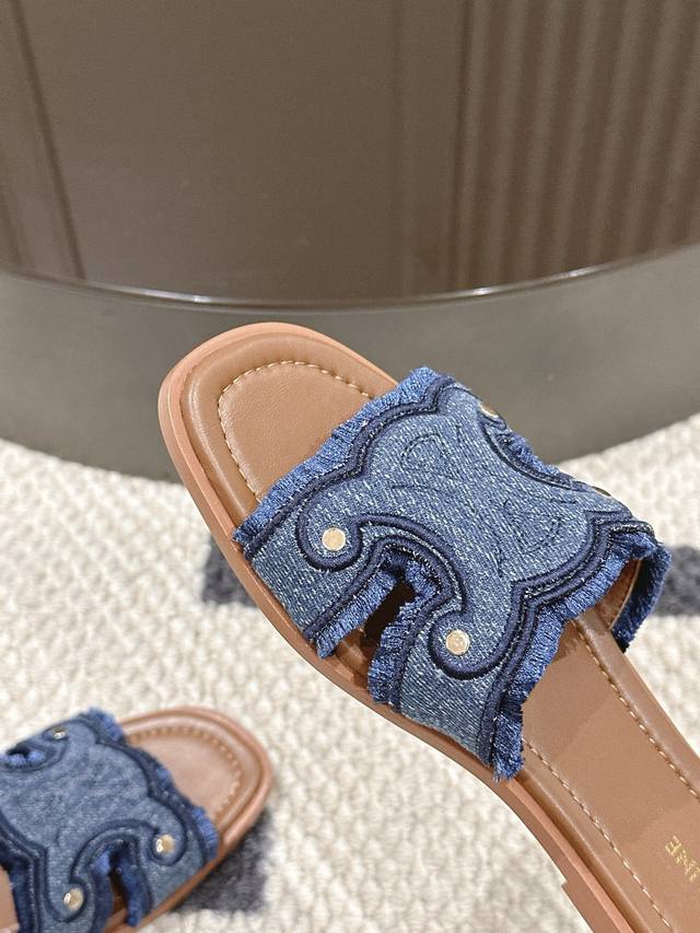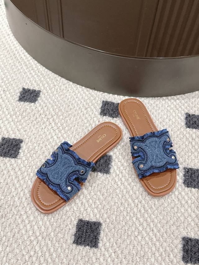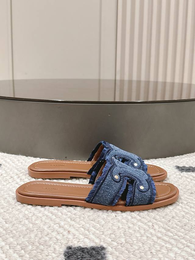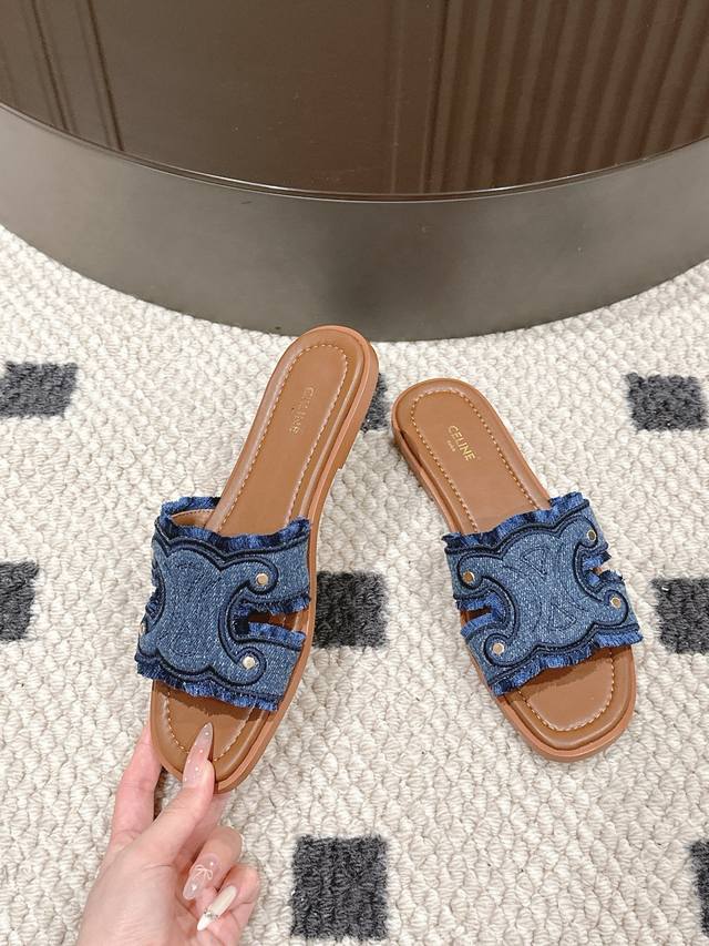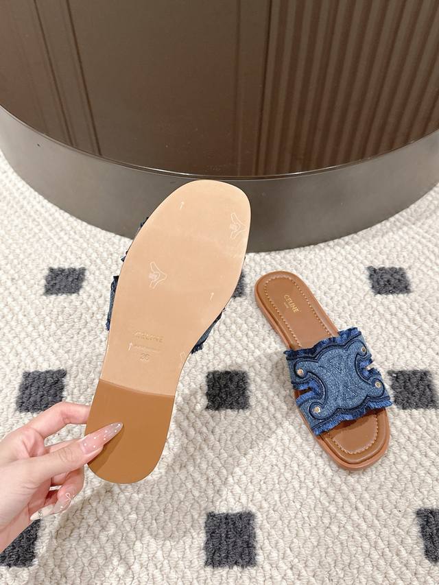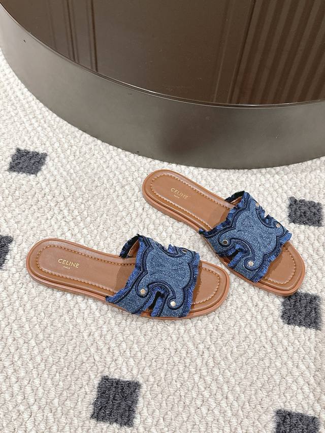 Celine赛琳牛仔布流苏拖鞋,牛仔+流苏的搭配也太酷了吧!休闲中带着小性感,搭配短裤或长裙都超有范儿~经典凯旋门标志,高级感直接拉满,简约又不失时尚态度,走在街上完全不用担心撞款,回头率超高,轻松拿捏各种风格,精致女孩必备!