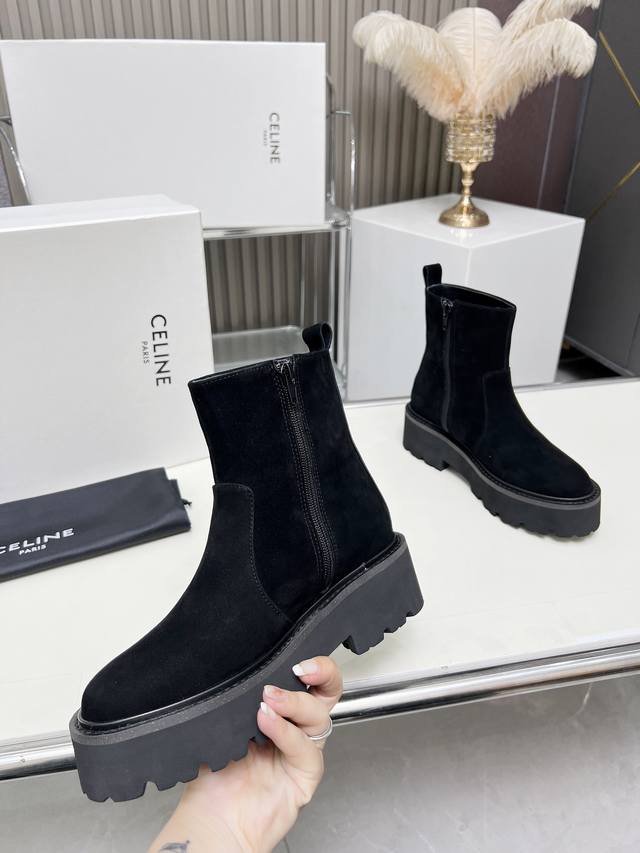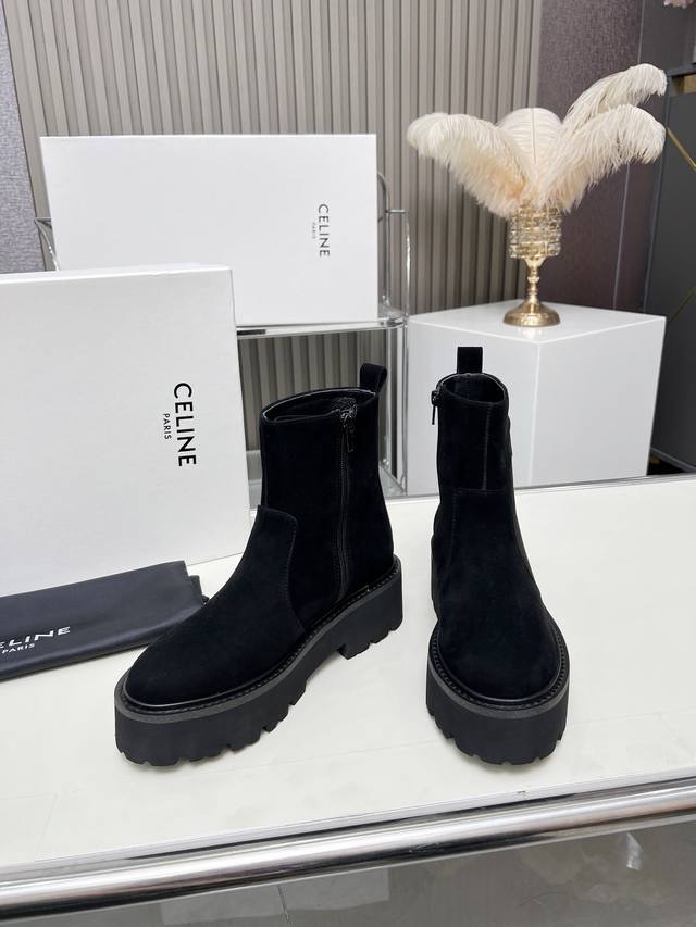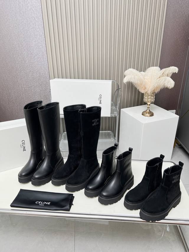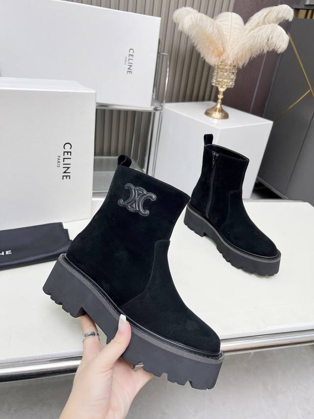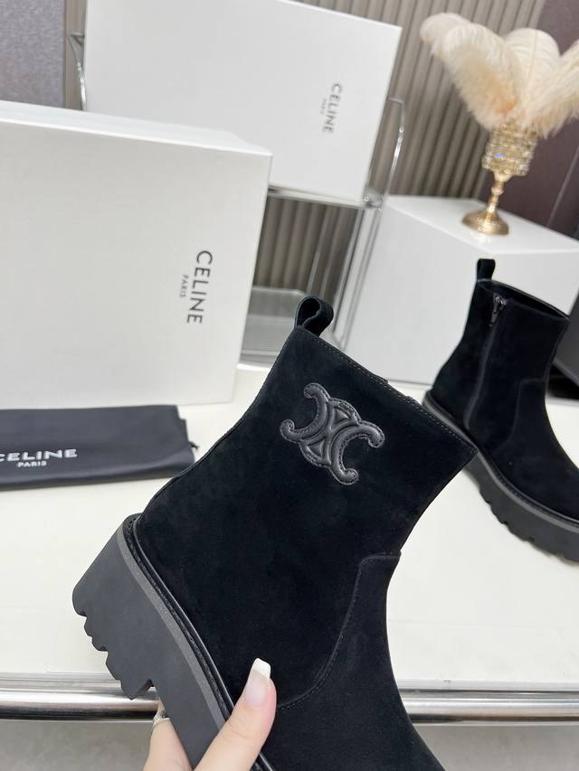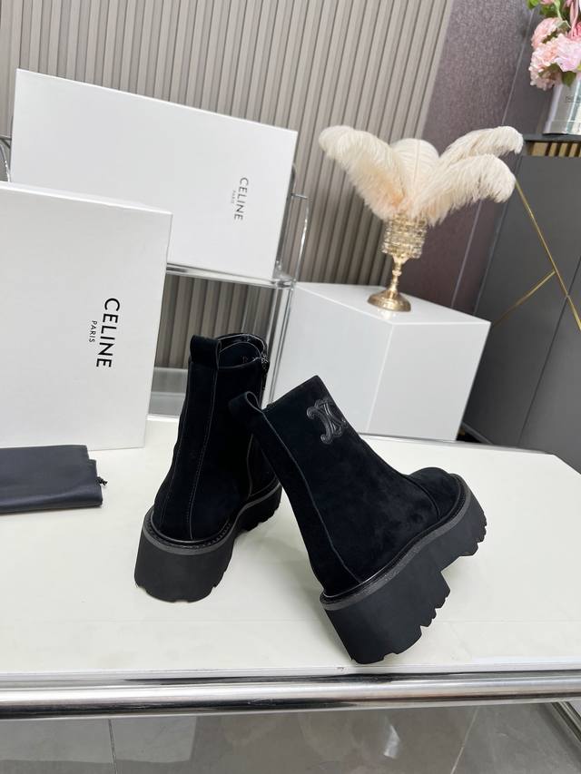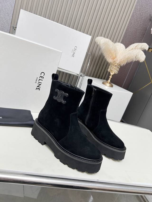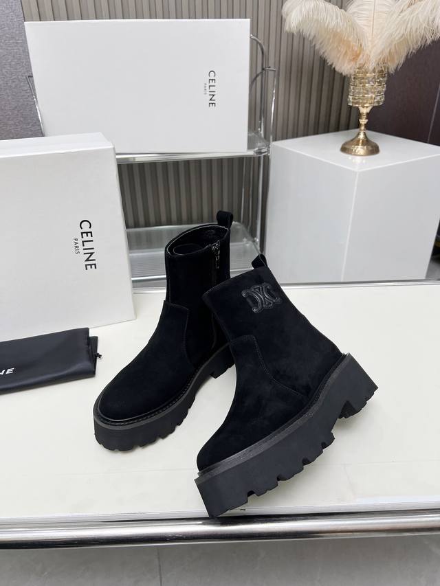 短靴270 Celine 赛琳2024凯旋门时尚百搭舒适厚底靴!!面料头层牛皮、高丝光羊京、内里羊皮发炮大底、标准码数35 40 41、42订做不退放!