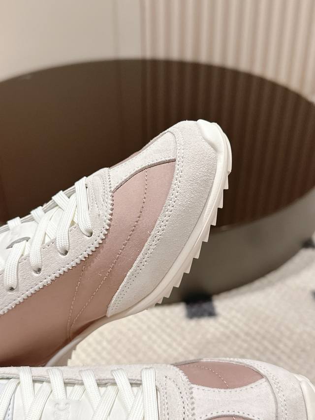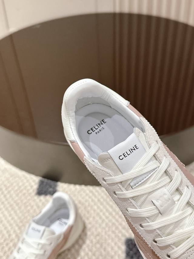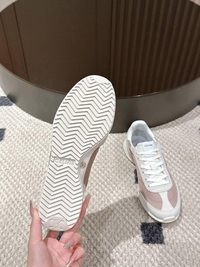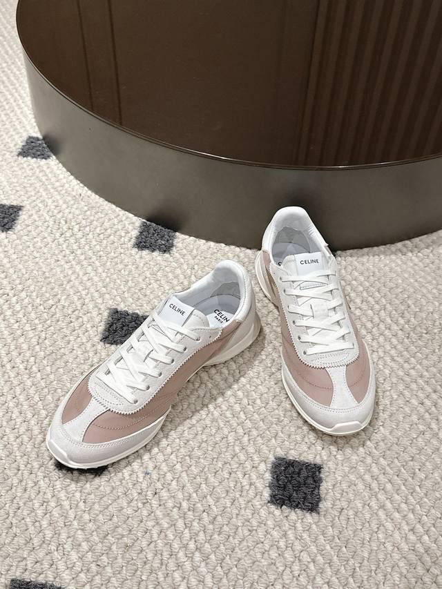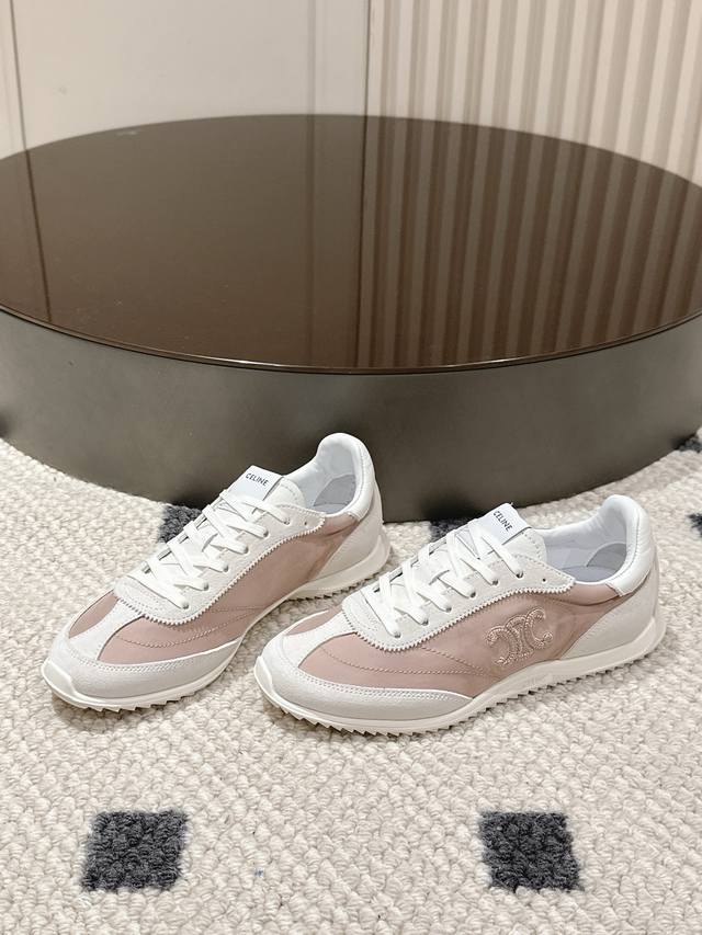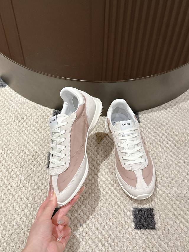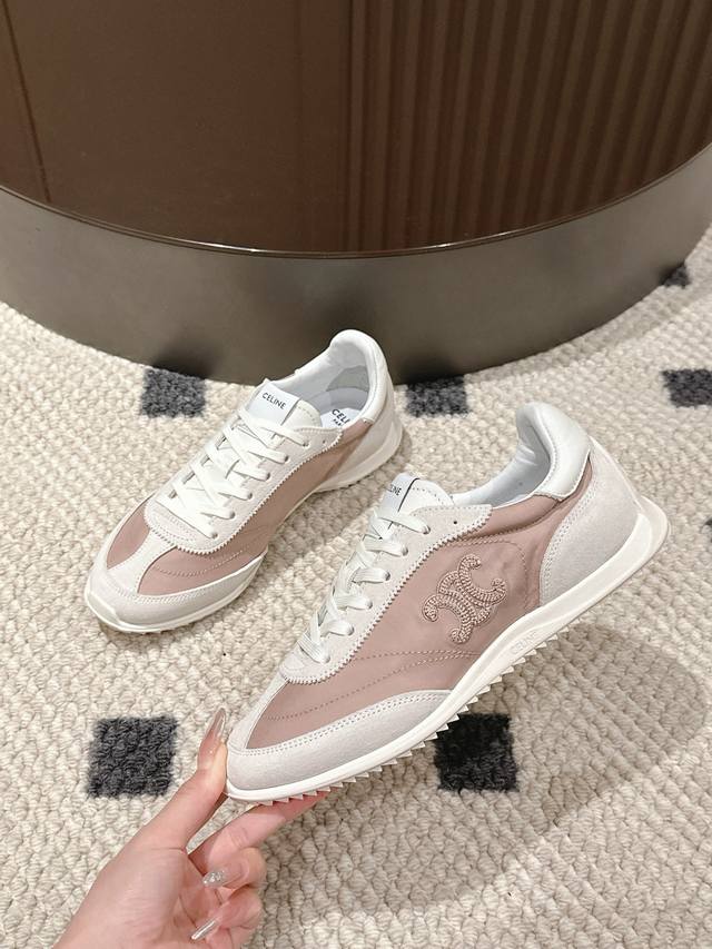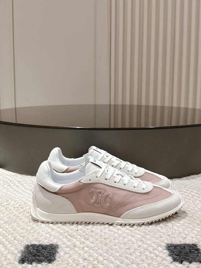 Celine Racer女士香草色低帮运动鞋,精致地重新诠释了1970 年代的运动风格,将怀旧魅力与现代优雅融为一体。Racer 作为Celine 鞋履系列的全新成员,以轻盈的鞋型,展现轻松随意的巴黎时尚,带来全天舒适体验。鞋面采用尼龙、绒面小牛皮和光滑小牛皮精制而成,丰富的纹理组合提升了复古跑鞋的设计感。其结构兼顾透气性和结构感,无论是休闲造型还是高级休闲装扮,都能完美契合。标志性的 Triomphe 标志体现了该品牌的精致美学,绣在侧面板上,并压印在后跟处,以微妙而奢华的