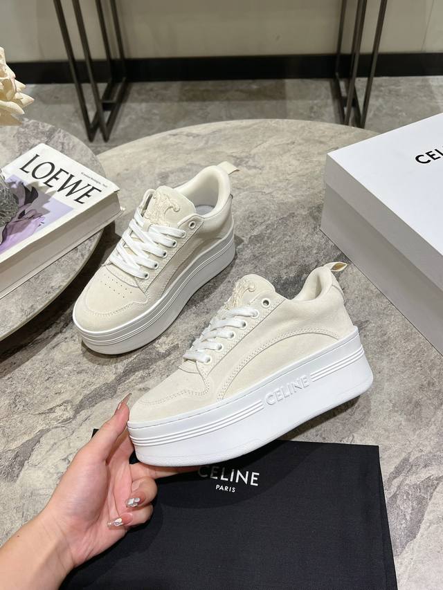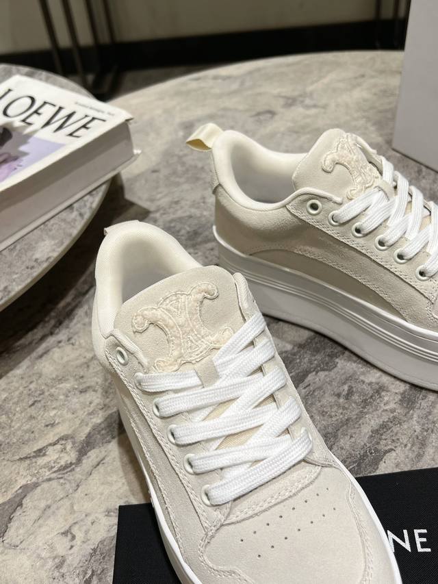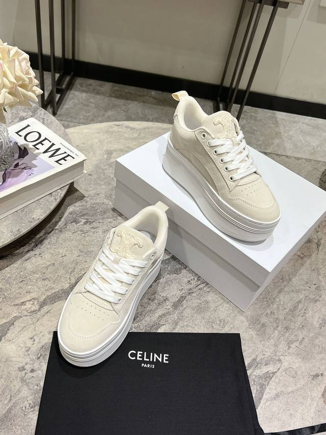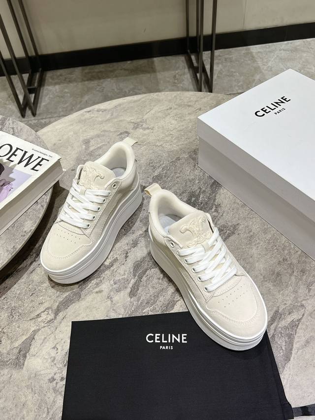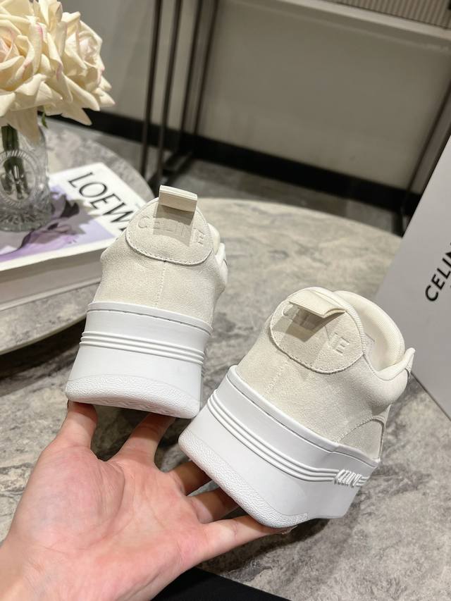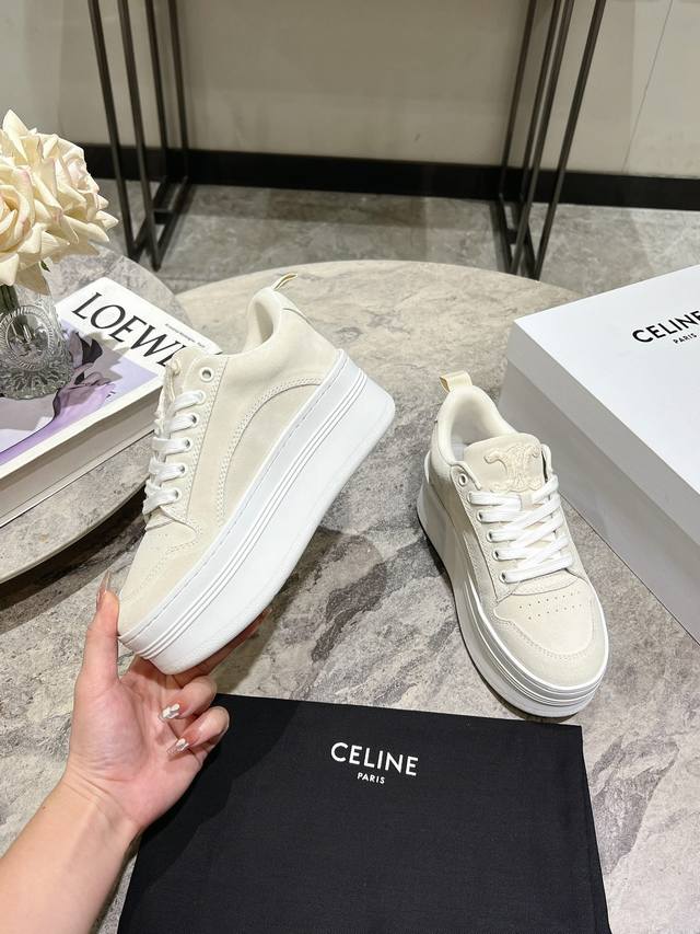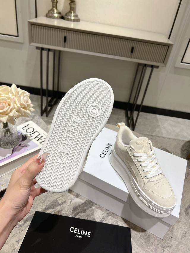 Celine 思琳 春夏走秀款面包鞋 Trainer厚底系列运动鞋、这一季运动休闲鞋无论从楦型的轮廓隔板的拼接都让人耳目一新、前后品牌Logo相呼应、大底边位明显Celine字母点缀、无不彰显品牌元素、鞋面高光丝牛绒、Tpu私模大底