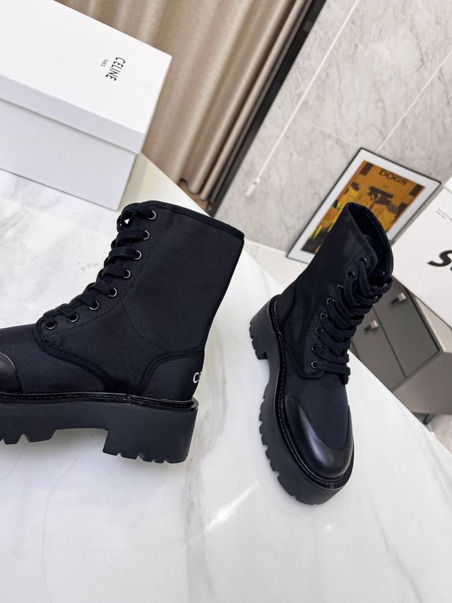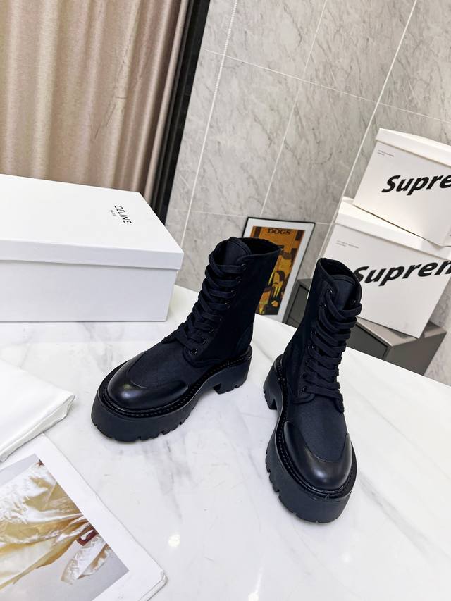 Celine 绑带靴,不得不说Celine现在的酷勾风拿捏的到位啊超帅气的一双靴子, 对于小个子来说又增高又显腿细的鞋都是好鞋哈哈 这双是尼龙布料所以对比其他靴