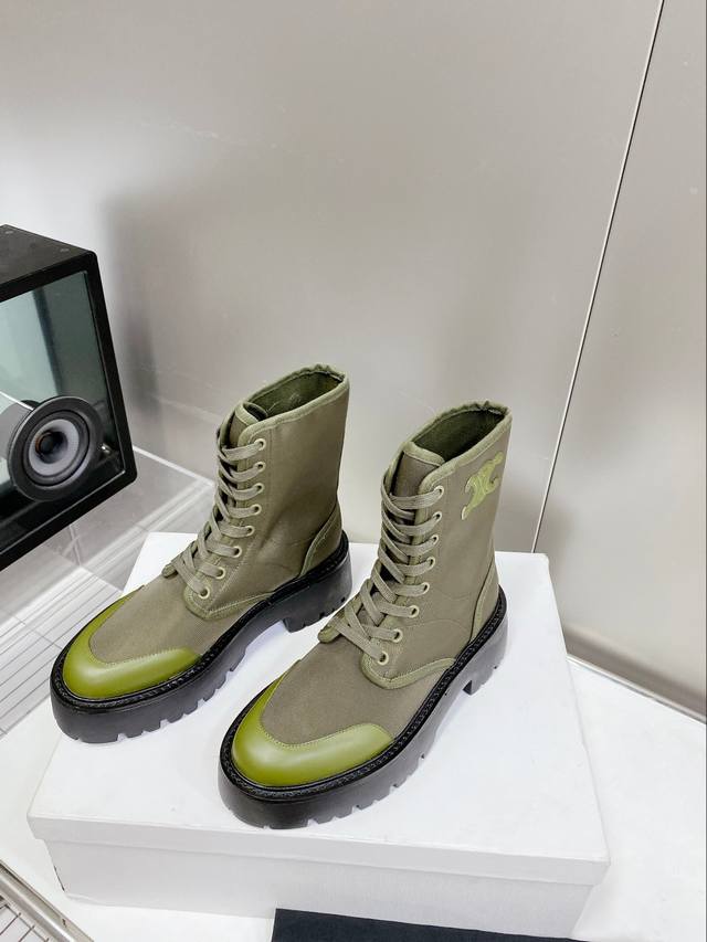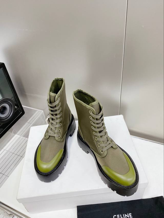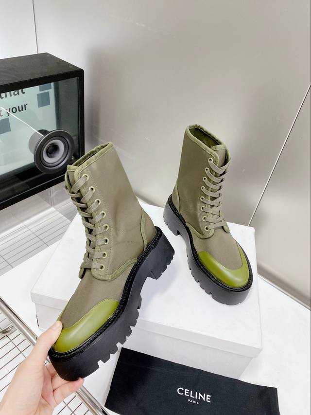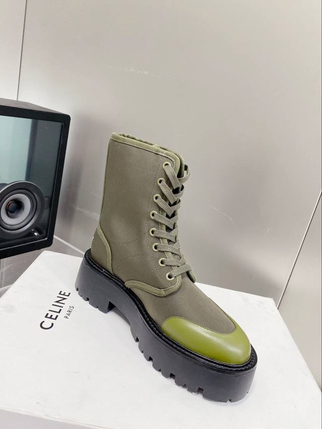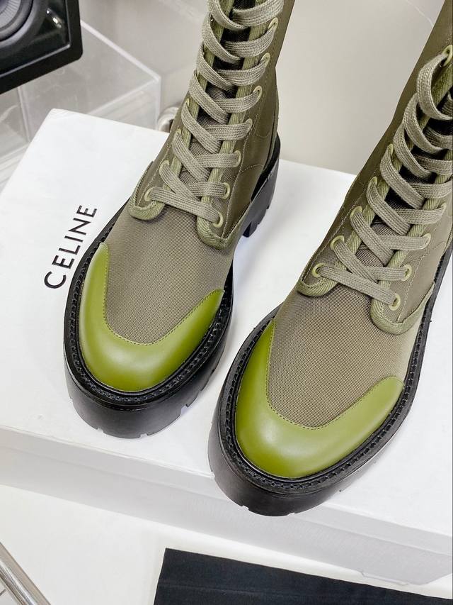Celine 绑带靴,Celine现在的酷勾风拿捏的到位啊超帅气的一双靴子,对于小个子来说又增高又显腿细的鞋都是好鞋哈哈 这双是尼龙布料所以对比其他靴子来说轻一些,厚底5Cm 尺码35 40