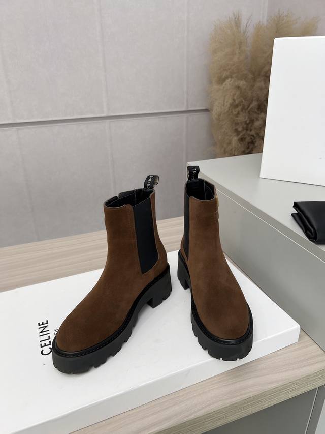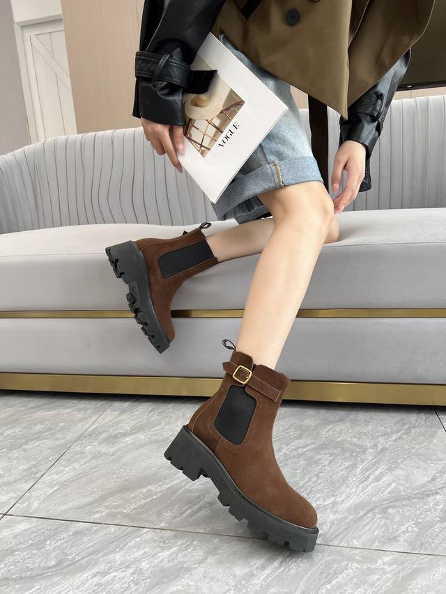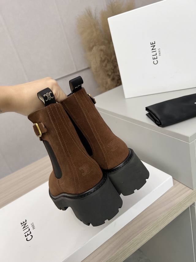 工厂p价 女装女鞋 运动原单 Celine思琳25新品凯旋门皮带扣切尔西粗跟短靴,无敌显瘦增高显腿细5Cm左右跟高,高丝光牛反绒面,羊皮里,35-41