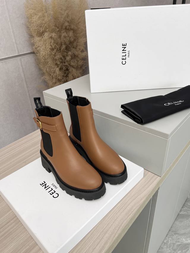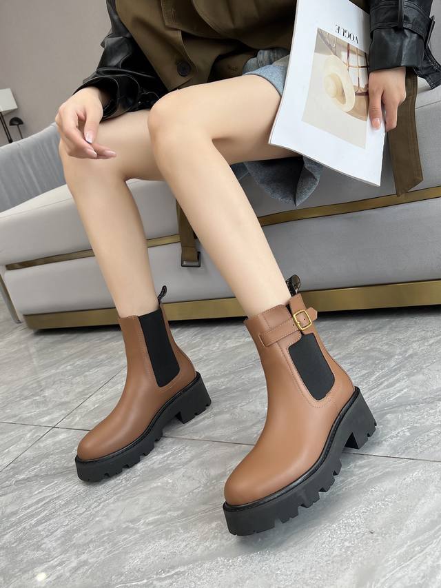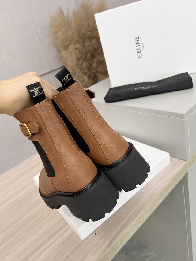 工厂p价 女装女鞋 运动原单 Celine思琳25新品凯旋门皮带扣切尔西粗跟短靴,无敌显瘦增高显腿细5Cm左右跟高,Napa头层牛皮面,羊皮里,35-41